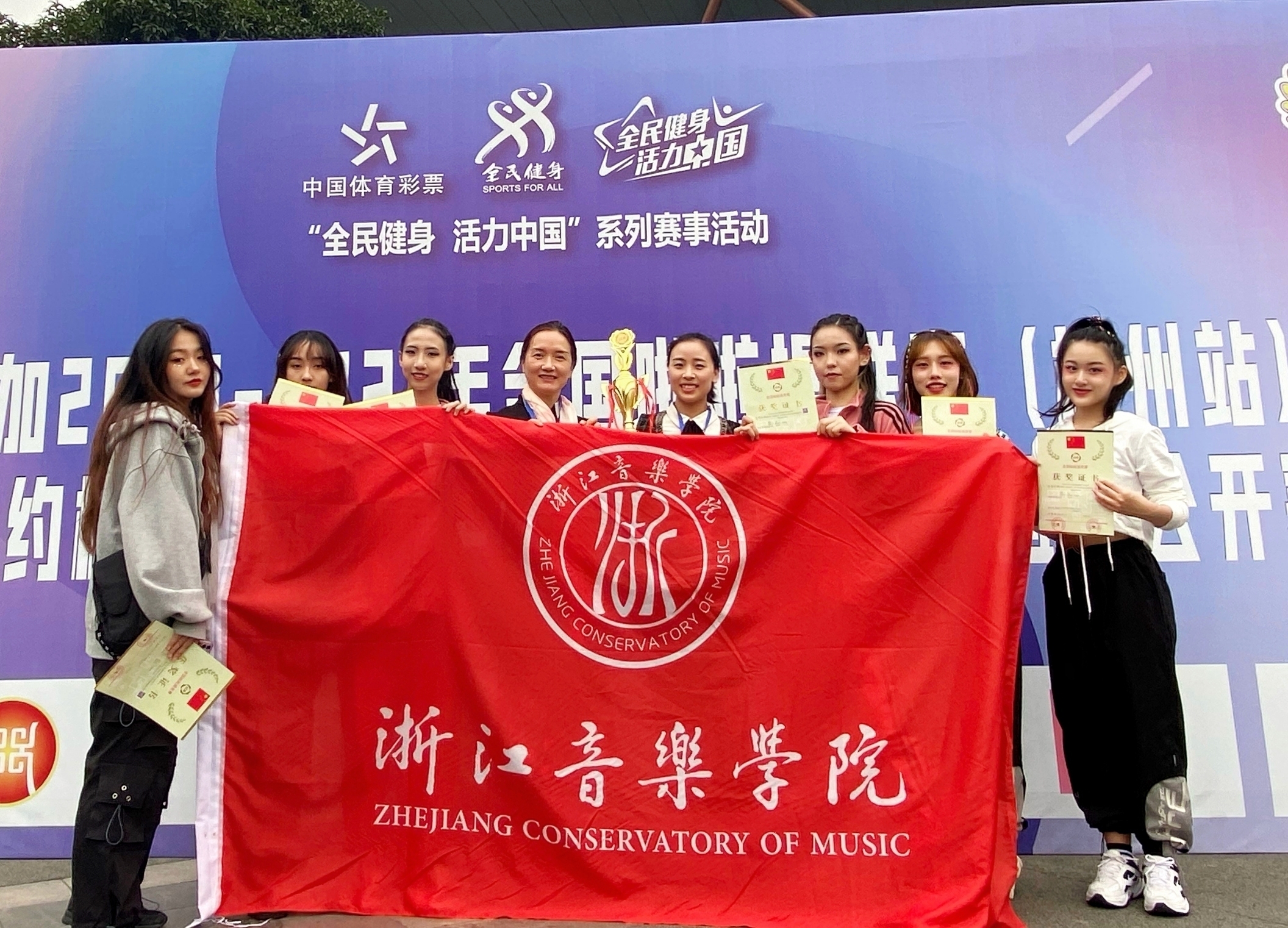11月1日,2020-2021年全国啦啦操联赛在杭州成功举行。共有来自全国各地的111支队伍、2200余名运动员参与,我校3支队伍分别荣获青年组双人街舞项目第二名、五名、七名。