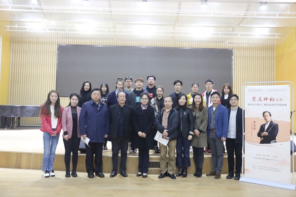杨春林为青年教师讲授了《室内乐合奏与二胡作品创作》,并对赵喆指挥、国乐系室内乐团演奏的《李叔同组曲》——为民族拉弦乐团而作(1)《春游》二胡创作部分,以及教师何娜演奏的二胡独奏曲《陕北抒怀》进行指导。他指出,乐队必须进入“融合”的状态,演奏员要对和声产生更加敏感的认知,同时还要熟悉其他声部的旋律发展,相互依附、呼应。他强调了音准在多声部室内乐合奏中的重要性,并强调,好的作品要来源于人民,服务于人民,呼吁所有的二胡演奏者要紧抓中华民族传统文化的根,并用音乐的力量将其发扬光大。