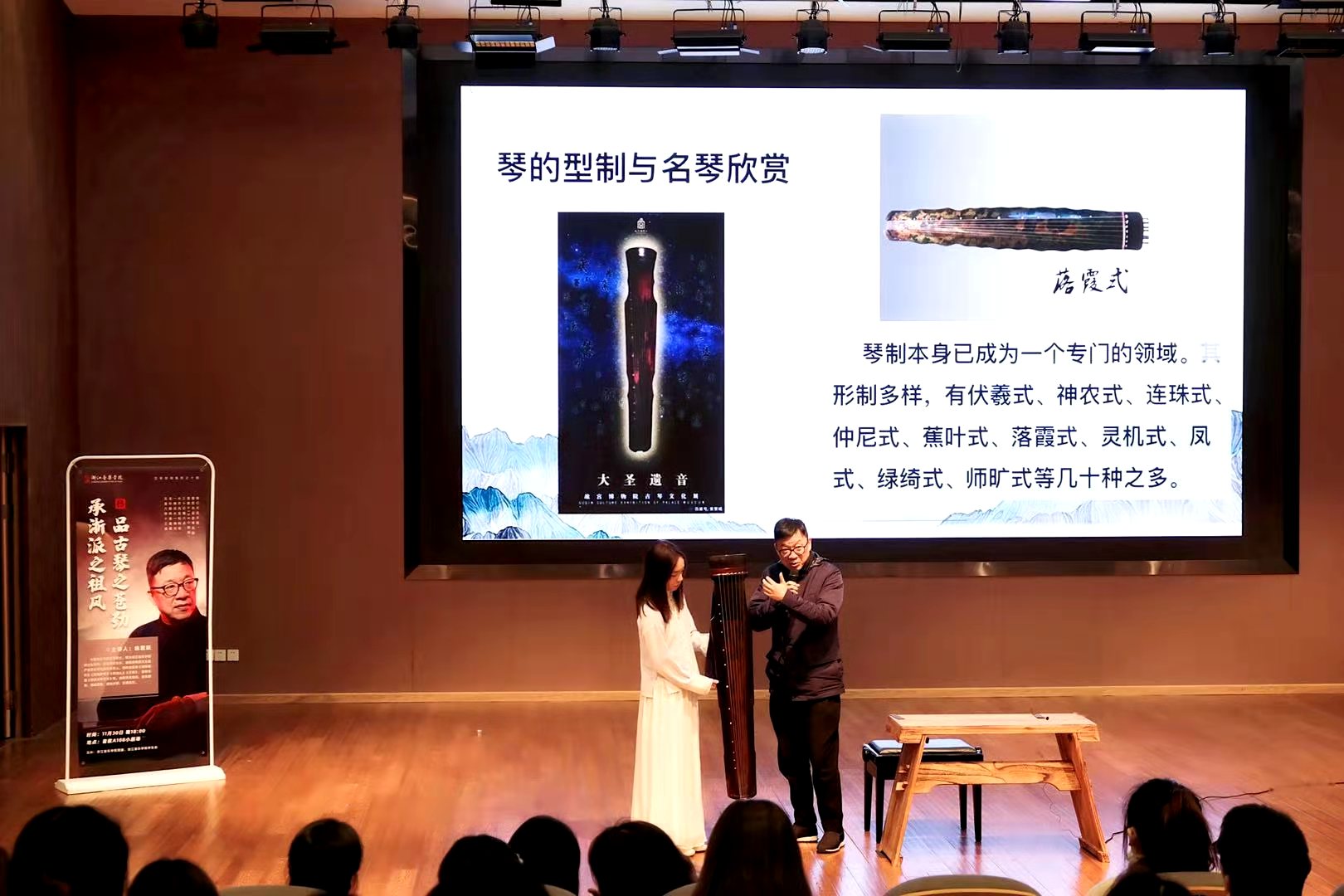 品古琴之苍劲,承浙派之祖风。11月30日晚,由校团委主办,学生会承办的第十四期艺享空间学术沙龙活动,在悠扬苍劲的琴声中拉开帷幕。本次活动由浙派古琴代表性传承人、国乐系教师徐君跃开展关于古琴艺术的专题讲座,60多名师生现场聆听学习。