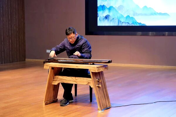 徐君跃讲解深入浅出、细致全面,并将理论讲解与现场教学相结合,邀请学生上台互动,手把手给予指导。他现场演绎了古曲《流水》,悠扬婉转的旋律如涓涓细流沁人心脾,又好似滔滔江河一泻千里,展现了浙派古琴大气磅礴的艺术风格。