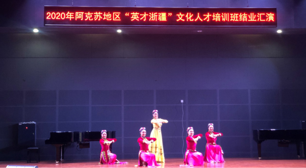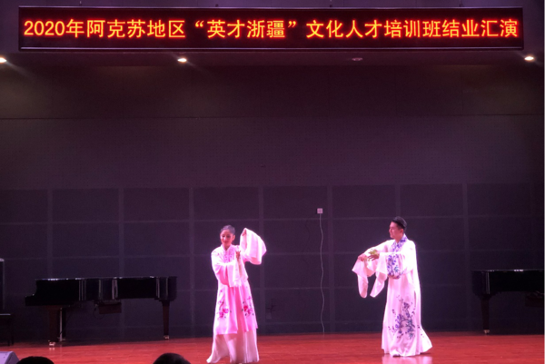最后,培训采取结业汇报演出的形式来呈现培训成果,呈现两地艺术的交融。结业演出剧目既有新疆的特色舞蹈、歌曲及器乐曲,也有学员在培训期间所学的京剧、昆曲及越剧选段。学员们以丰富多彩的艺术形式,既诠释了极富民族风格的作品,也展现了中国传统戏剧的艺术风貌。少数民族独特的民族风情与独具魅力的戏剧文化同台交汇,呈现了一场触及心灵的艺术盛宴。培训结束后,“英才浙疆”文化人才培训班学员们表示:“我们将怀着一颗感恩的心、一颗好学的心、一颗对艺术崇敬的心,把浙江的文化灵气带回阿克苏,让文化交往交流交融生生不息,践行好‘文化润疆’,让艺术之花艳丽绽放。”