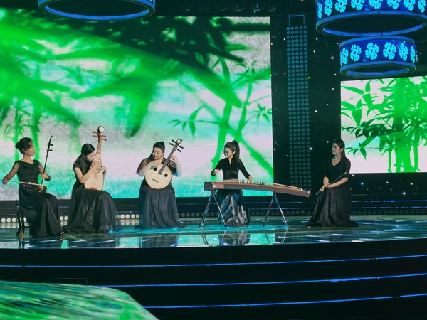 由国乐系副主任刘乐,教师赵琦、杨磊、贾真珍、徐艺芳、何娜、杨婧领衔的浙音民族室内乐团,演绎了刘乐创作的民族室内乐作品《岁岁年年》。作品运用了古曲《梅花三弄》的旋律素材,借梅花傲逸之姿,歌颂了中华传统文化中的人文风雅,寓意了国泰民安、风调雨顺的美好愿景。由国乐系翡翠筝团演绎、作曲与指挥系副主任王云飞创作的《锦上云华》《激情跨越》,分别呈现了弘扬大国工匠精神、传递文化自信以及讴歌时代成就、展望美好未来的主题,再现了去年CCTV中国器乐电视大赛上的获奖风姿。王云飞创作的另一首重奏作品《笑》,由国乐系教师张咏音、陈京京,附中教师韩慧慧及国乐系学生谭紫玲、王亦微演奏,作品以“笑”为题材,从生活中寻找灵感,风格幽默、诙谐,颇具艺术性和感染力。《无上清凉》《大隐之境》两首三重奏作品,由国乐系教授盛秧、附中教师韩慧慧以及学生谭紫玲演奏,两部颇具禅意的音乐作品,呈现出万籁复归、远离凡尘、隐匿于世、怀抱自然的悠然心境。《弦锁时光》由国乐系副主任刘乐创作,并携国乐系学生伍妍梦、蔡钰卉演奏。作品从脍炙人口的童谣中吸取元素,将时针的转动化作指尖的拨动,借音乐抒发对纯真童年的怀念和对时光流逝的叹息。