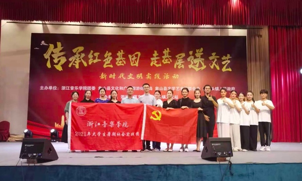 在庆祝中国共产党成立100周年之际,为扎实推进大学生党史学习教育,强化实践育人成效,7月17日,学院国乐系、戏剧系、舞蹈学院师生以“传承红色基因,走基层送文艺”为主题,在象山县开展为期10天的大学生暑期社会实践活动,通过走基层、送文艺、为群众办实事等多种形式,助力浙江共同富裕示范区、美丽乡村精神文明建设,激励青年学子在学思践悟中学党史、强信念、跟党走,努力成长为德智体美劳全面发展的社会主义建设者和接班人。