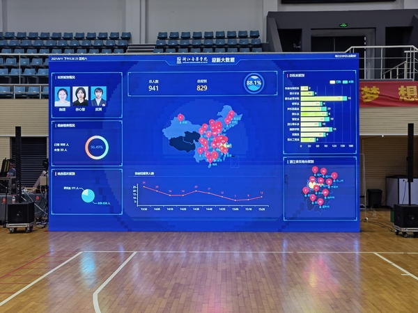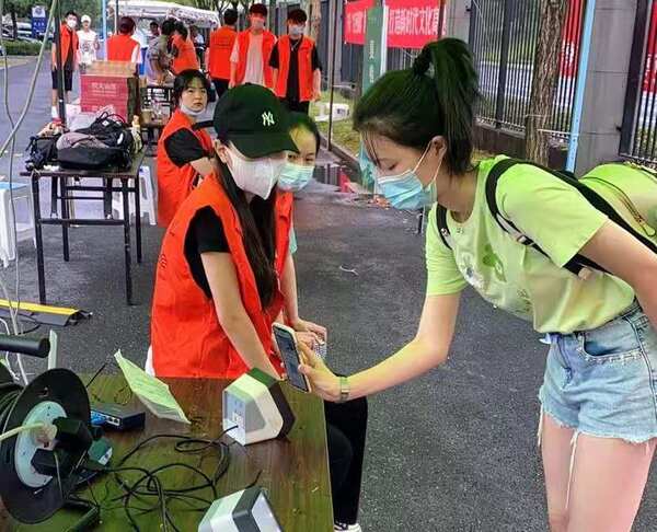 报到当天,机关信息技术与招生联合党支部还组织党员和志愿者早早在校门口热情迎接新生,这也是该支部主题党日活动的重要内容。根据学院疫情防控需要,党员和志愿者们耐心引导新生打开“掌上浙音”,点击“电子通行证”扫码入校,通过人脸识别测温器完成识别和测温,并引导他们通过系统提供的报到点、宿舍等信息办理相关手续。与此同时,体育馆里还设置了40平方米的电子显示屏,上面实时显示迎新数据,学院领导、相关部门、系部教师手机终端也同步显示迎新数据。高效协同、平稳有序的数字化迎新场景在校园里呈现,发挥着基础保障的作用。