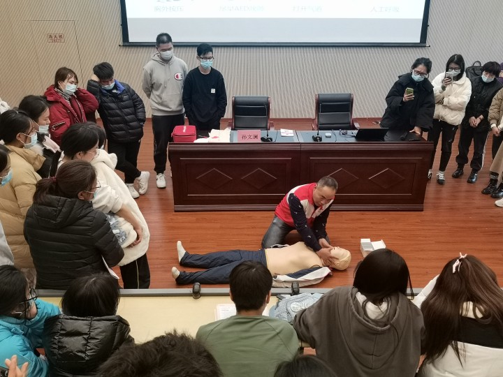 培训期间,孙文澜用生动幽默、浅显易懂的语言将心肺复苏术、自动除颤仪的使用、创伤应急处理等专业知识传授给广大师生。现场师生还在专家的指导下,逐一练习心肺复苏术及AED的操作。通过理论讲座及现场演练相结合的方式,大家兴趣浓厚、收获满满,初步掌握了应急救护的相关技能。