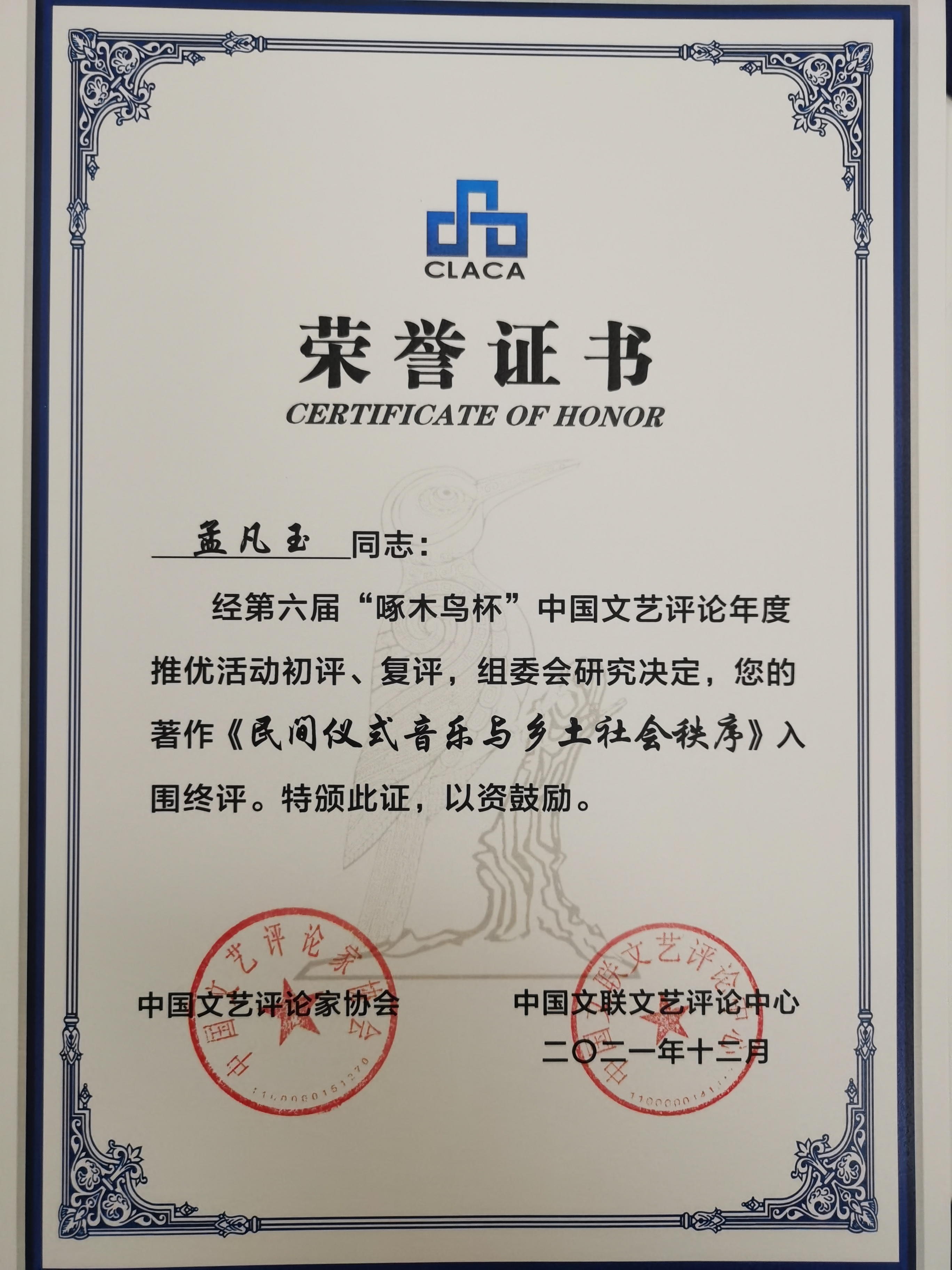《民间仪式音乐与乡土社会秩序》入围第六届“啄木鸟杯”中国文艺评论年度推优终评