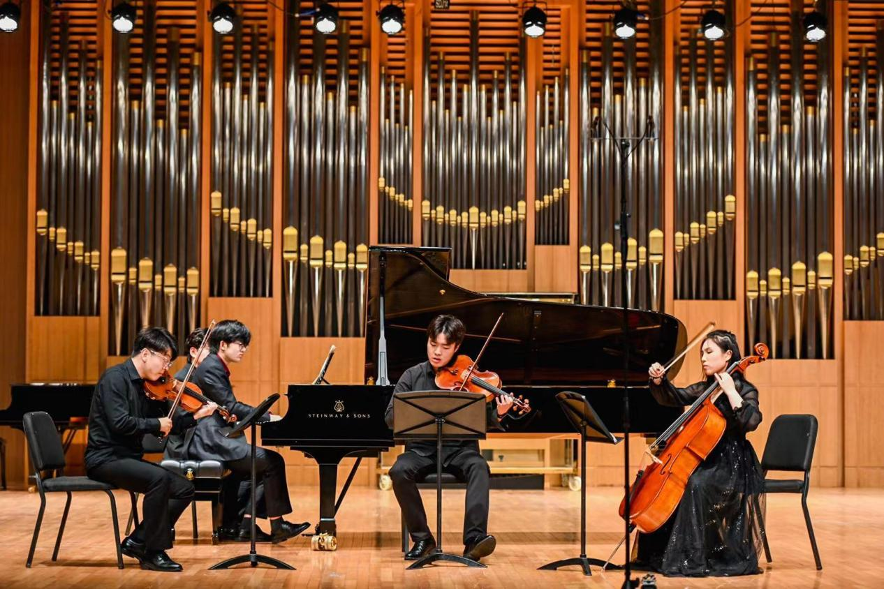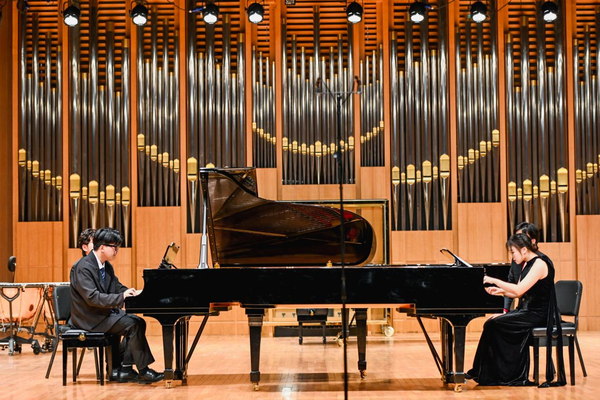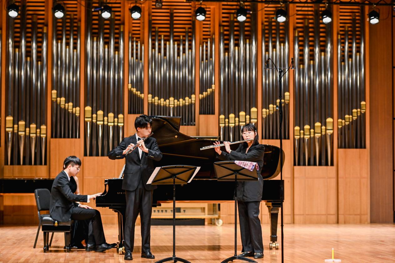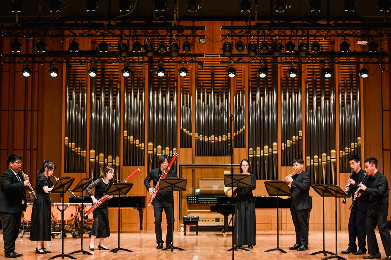 在随后举办的音乐会上,开场的木管八重奏《莫扎特c小调小夜曲》奠定了整场音乐会的高雅基调,巴洛克时期音乐的饱满和活泼在这首小夜曲中得到了充分的体现。接下来的《F大调弦乐四重奏》是贝多芬早期创作的代表作品之一,轻盈纤细的小提琴、甜美甘醇的中提琴与浑厚低沉的大提琴交相辉映,相互烘托出平衡、饱满的音响。两首双钢琴作品——米约的《丑角》和卢托斯瓦夫斯基的《帕格尼尼变奏曲》将音乐会的气氛推向了高潮。《丑角》融合了多种音乐表达方式和风格,既典雅精致又展现了拉丁美洲的异国情调。《帕格尼尼变奏曲》是卢托斯瓦夫斯基于1941年创作的双钢琴作品,两位演奏同学以扎实的基本功、精湛的演奏技巧、细腻的情感表达,在独立与统一、和谐与对比中,凸显了作品的魅力。德拉诺夫的《高贵的沙龙音乐》仿佛把听众们带回到20世纪欧洲的高雅舞会中。音乐会在旋律优美,富有浓厚的民族风情的德沃夏克《降E大调钢琴四重奏》第四乐章中落下帷幕。