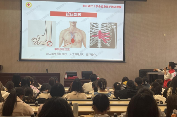 浙江省红十字会急救培训专家罗原医生首先为广大师生员工讲解了心肺复苏术、自动除颤仪的使用、创伤应急处理、气道异物梗阻解术等常用急救知识,并介绍了急救过程中应当采取的正确措施和注意事项。她还配合采用仿真人模拟演示,并邀请师生参与实践演练。最后,医护人员针对师生的现场提问一一进行了细致的解答。