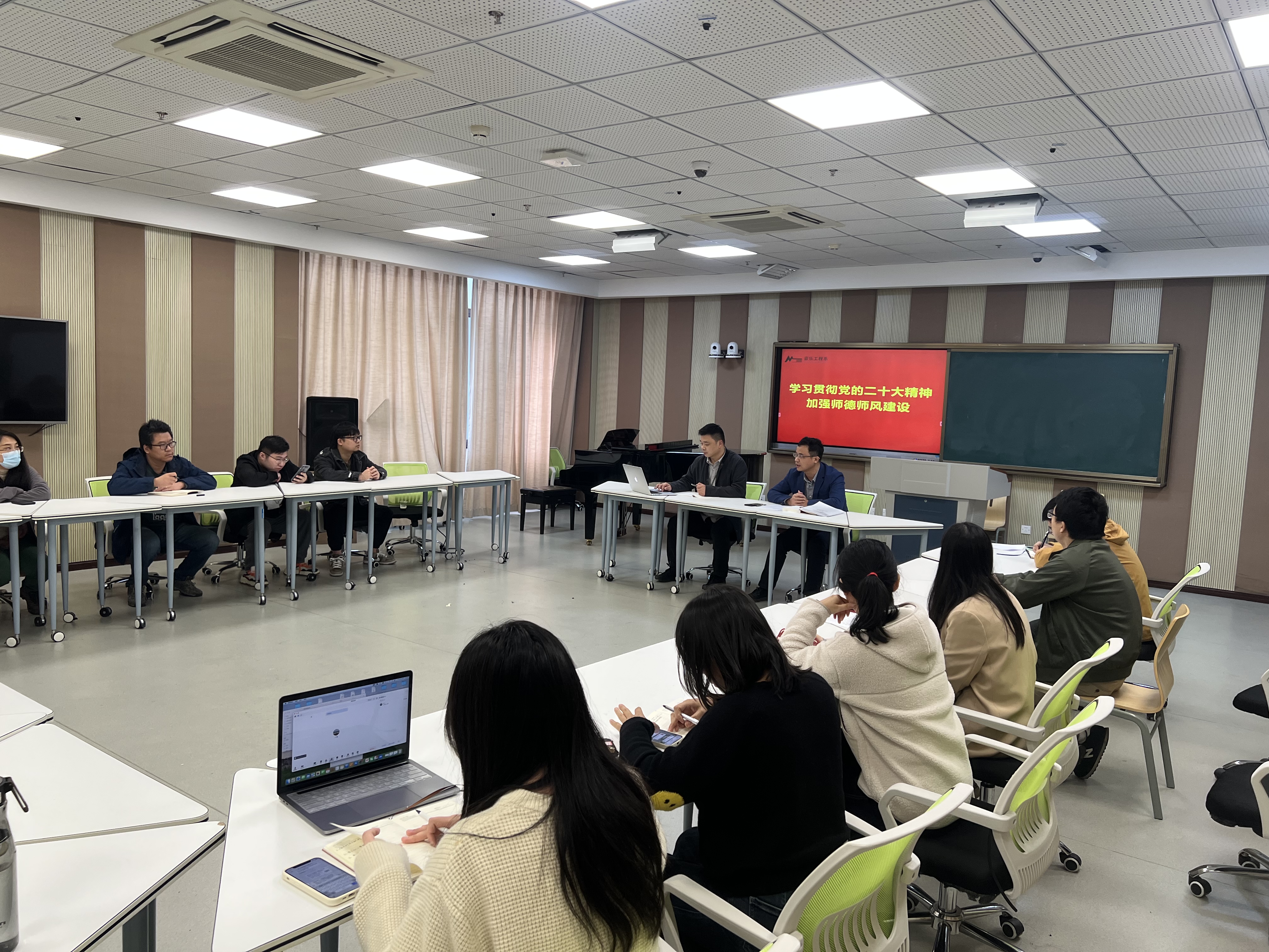 为进一步学习宣传贯彻党的二十大精神,认真落实《关于组织开展第三届师德师风建设主题教育月活动的实施方案》的相关要求,近日,音乐工程系组织全体教师召开政治理论学习会,引导广大教师坚定理想信念、厚植爱国情怀、涵养高尚师德。