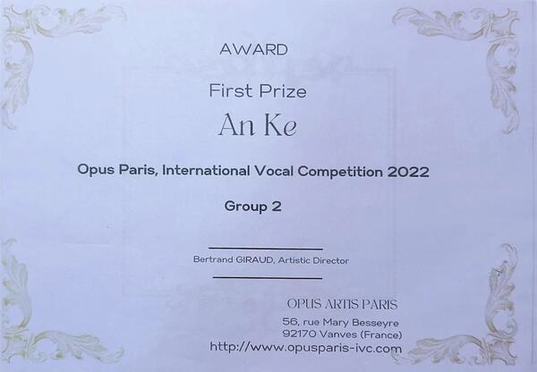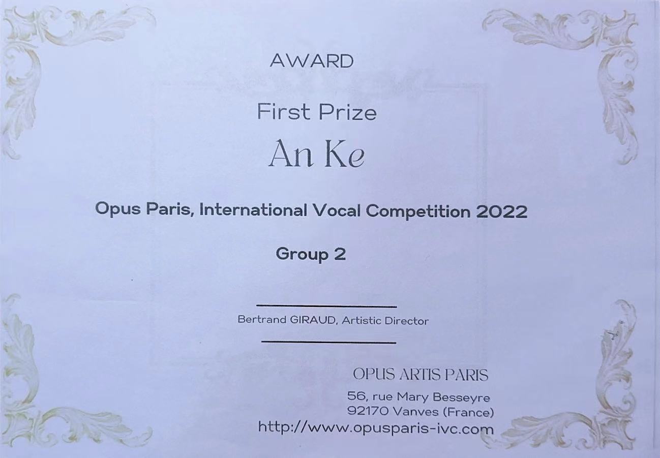 学院声歌系青年教师获2022 Opus法国巴黎国际声乐比赛一等奖