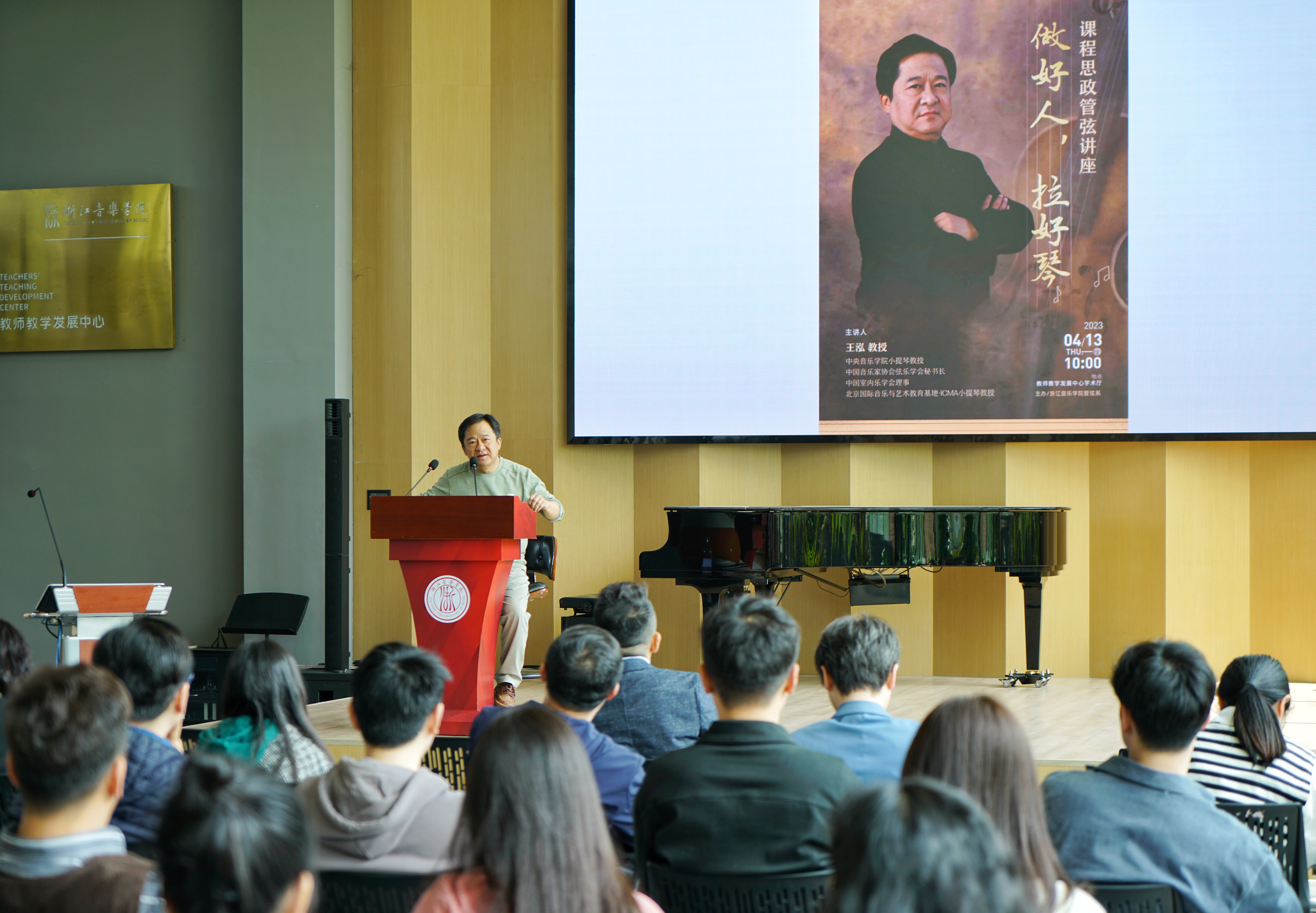 4月13日,管弦系特邀请中央音乐学院小提琴教授、中国音乐家协会弦乐学会秘书长、中国室内乐学会理事王泓来校开展课程思政讲座、小提琴大师班及学术交流。学院副院长、管弦系主任董德君教授主持讲座。