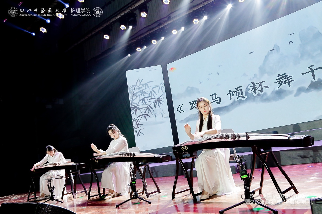 在浙江中医药大学护生加冕典礼的现场,古筝重奏《蹀马倾杯舞千秋》气场全开,琴弦舞动、苍韵松古,绕梁余音像月华般倾泻在每位观众的心中。