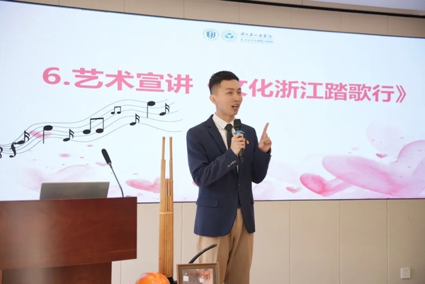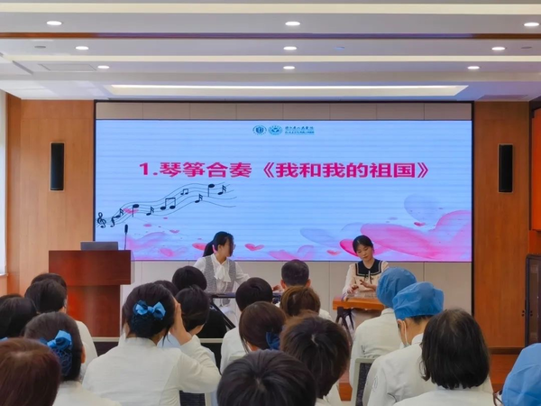 在植被繁茂、背倚青山的浙江省人民医院望江山院区,国乐学子演奏了琴筝合奏《我的祖国》、笛乐独奏《三五七》、笙协奏曲《望夫石的美丽传说》,用美妙乐声致敬无私奉献的医护工作者们,校青年理论家宣讲团王刘同学还带来了精彩的艺术宣讲。医护工作者徜徉在悠扬动听的丝竹乐声之中,感受到来自音乐的温暖与感动。