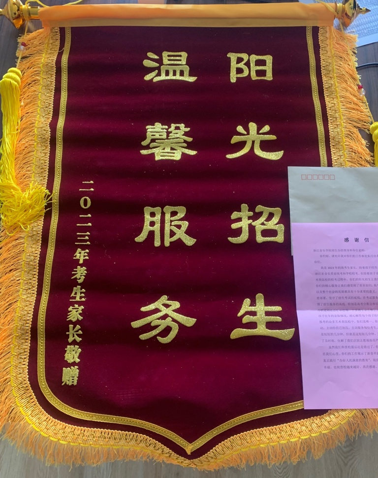 “浙江音乐学院阳光招生让我们考生家长感受到公平公正,暖心服务让我们感受到宾至如归。在招生工作中,浙音主动担责,服务每位考生和每个家庭……”近日,学院收到2023年高考考生家长寄来的感谢信与锦旗,字里行间表达了对学院招生考试相关工作的高度赞誉,以及对相关工作人员的由衷感谢。