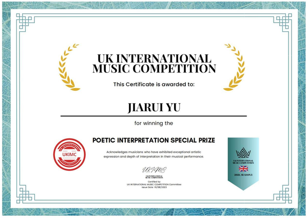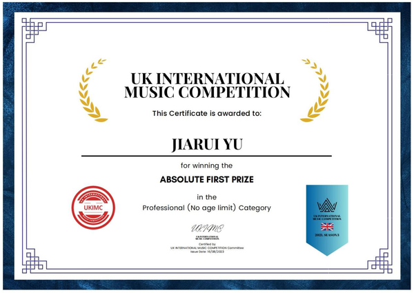 近日,2023年英国国际音乐比赛(UK International Music Competition)第三赛季比赛落下帷幕,我校作曲与指挥系俞嘉睿同学(指导教师:作曲与指挥系副教授高健)荣获专业组及高级组两个组别本届赛事最高奖项白金奖项(绝对一等奖),同时荣获组委会优秀特别奖。