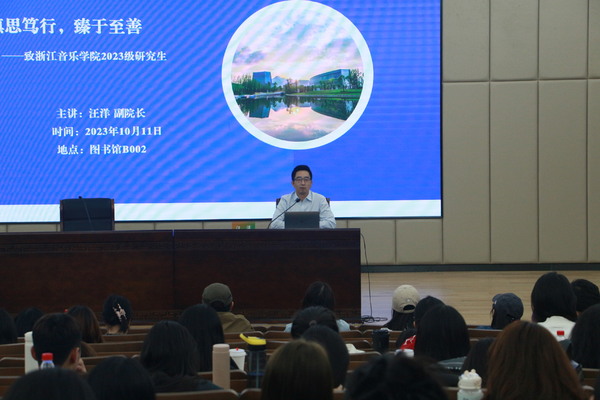 汪洋首先代表学院,欢迎222名研究生新生加入浙音这个大家庭,并为各位新生介绍了学院的历史、环境及资源。接着,他以“何为研究生”为题,通过对“研”字进行字义解释,以及对国家现行研究生制度的解读,鼓励研究生新生们能像“研”字释义一样,以“勇于劈开石头的精神”开展学术研究。他通过引用孔子、傅雷、陶行知等名家名言,希望大家处理好研究生学习过程中“形而上与形而下的关系”“学习与生活的关系”“学问与做人的关系”。最后,他深情寄语同学们,“学贵有恒,切莫半途而废;才需积累,莫轻一篑之功”。愿大家做不负韶华的追梦人,志存高远、笃行不怠、学有所成、研有所获。