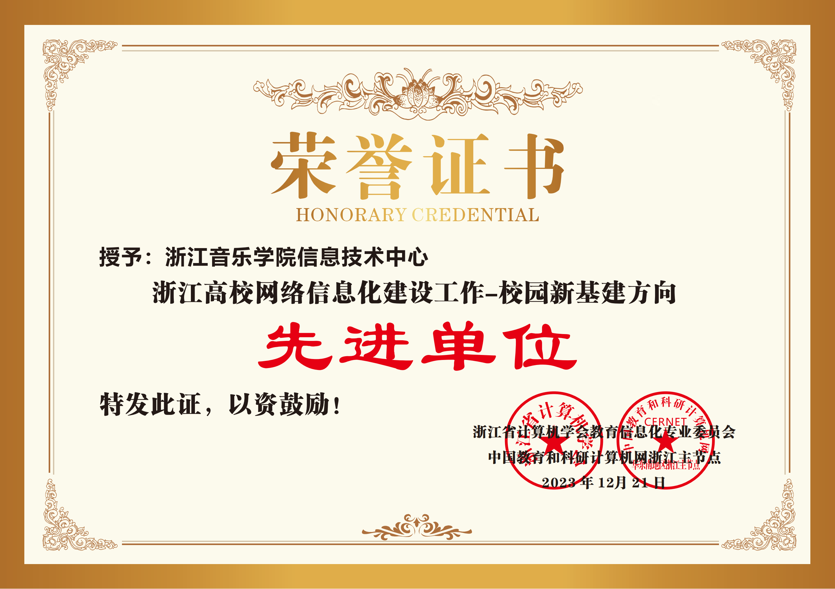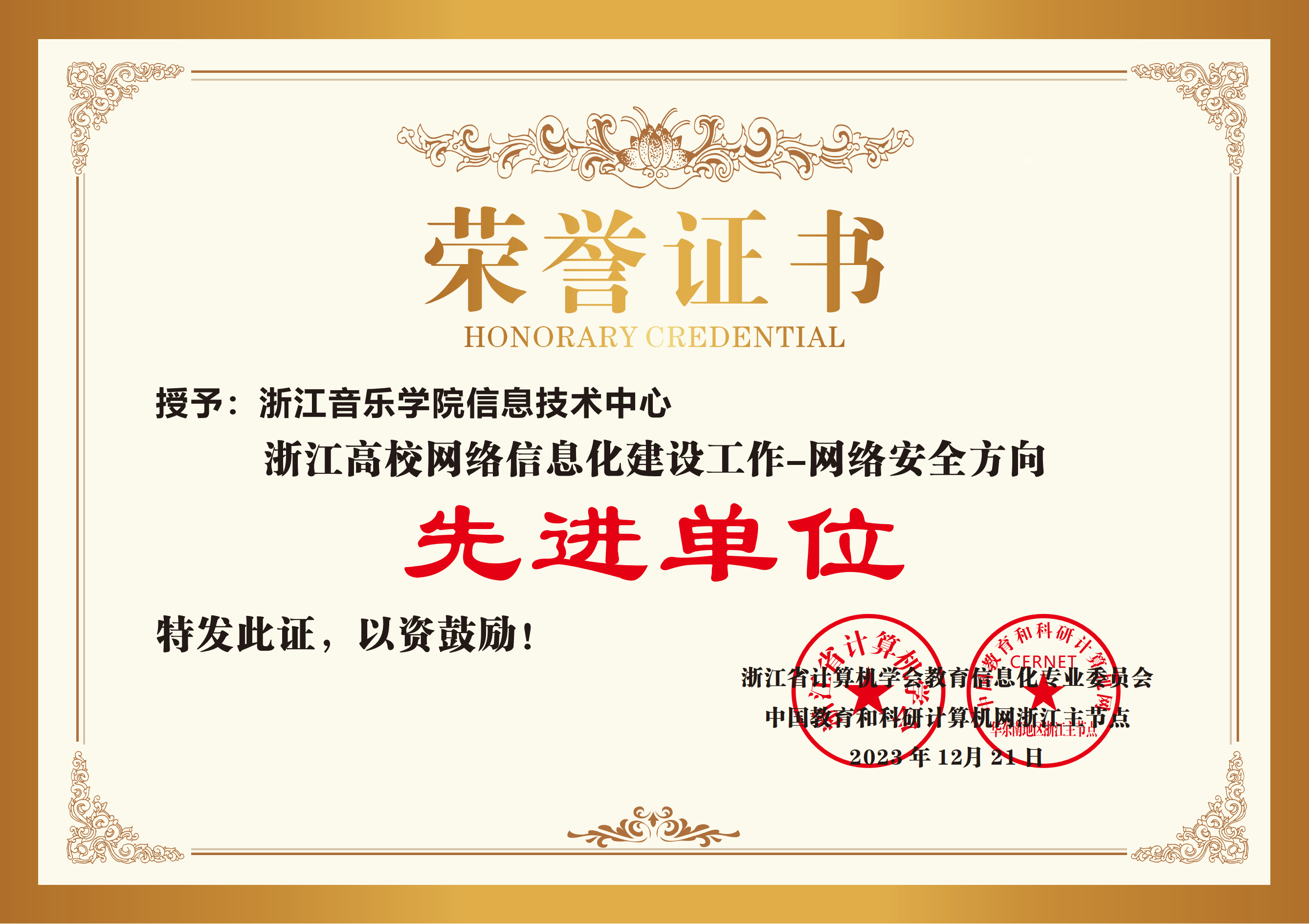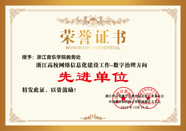 近日,浙江省计算机学会教育信息化专业委员会、中国教育和科研计算机网浙江省主节点联合评选了2023年浙江高校网络信息化建设先进单位。学院教务处、学生处分别荣获“数字治理方向先进单位”,信息技术中心荣获“网络安全方向先进单位”和“校园新基建方向先进单位”。