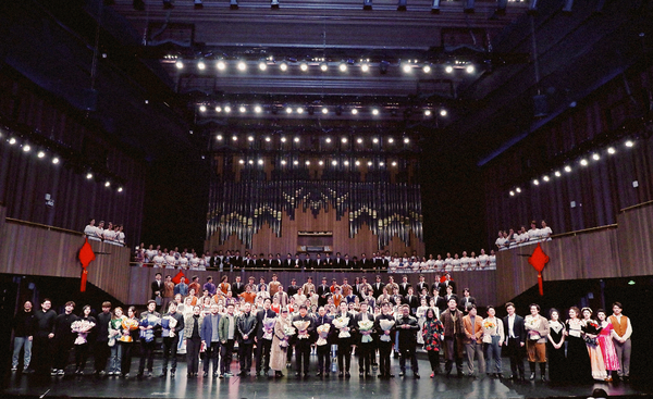 演出结束后,学校领导上台与一众演职人员和工作人员握手致意,对本场音乐会的整体效果予以肯定并合影留念。