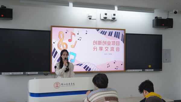 钟紫怡从创新工作室、精神内核、个人经历、市场分析几个方面介绍了她的创业经历。从刚开始的一间房到现在拥有400多平方的双层工作室,这离不开她从实践中习得的经验,将学习实践运用在琴行的创新模式中,形成了特有的录音棚课堂、双钢琴教学、阶段性音乐会、弦乐课堂与钢琴教学相结合等教学模式,这一系列的琴行创新模式都是嘉尚音乐工作室取得成功的必要条件。秉持着“向下扎根,向上生长”的教学理念,钟紫怡的工作室会定期邀请大师开展讲座、举办公益活动等,为学子树立榜样和公益的力量。她说,创业之路不易,在大学阶段如何做好职业规划,创新音乐之路,是每位同学应该思考的,人生之路是曲折向上的,坚毅、勇敢的品格也是每位大学生所必备的。随后她还讲述了升学、考编、创业的抉择与实践。