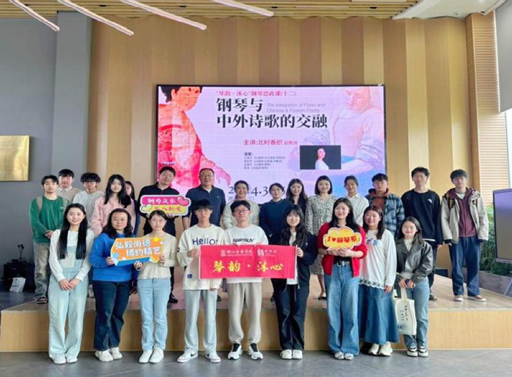 3月25日中午,“琴韵·沐心”钢琴思政课(十二)——《钢琴与中外诗歌的交融》在教师教学发展中心学术厅顺利举行。本场活动由钢琴系北村香织副教授主讲,研究生金雅玲、陈靖、王倩文(声歌系)、郑舒尹(声歌系)助讲演奏。钢琴系负责人,教师党支部书记,部分钢琴系、声歌系教师及钢琴系大二、研一学生参加此次活动。