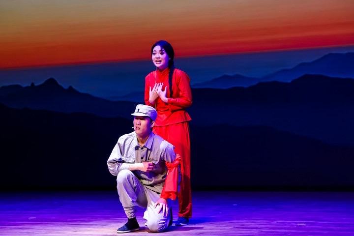 活动现场,两名影视表演班学子张高源、于雪晴通过舞台剧的艺术转化,带来一段红色的记忆与剪影《蒙山谣》,节目中人物故事的冲突和张力,被展现得淋漓尽致,生动诠释了红色精神中军民一心、水乳交融的深厚情感,令在场观众颇为动容。