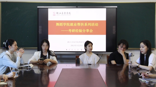 为深入推进学风建设,培养学生严谨的学习态度,营造浓厚的考研氛围,助力2025届学子考研,5月24日中午,舞蹈学院举办“舞境至善”就业创业帮扶行动之考研经验分享会,邀请徐浙岚、余汶哲、秦乐儿、盛晓叶子、郑涵5位同学为有考研意向的学弟学妹分享自己的考研经历。