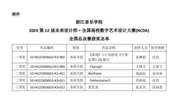 近日,第12届未来设计师•全国高校数字艺术设计大赛全国总决赛落下帷幕,音乐工程系学子表现突出,参赛的五部参赛作品全部获得奖项。其中,音乐设计与制作211班-张博韬作品《渗透——为游戏<守望先锋>CG配乐》(指导老师:沈佶)荣获一等奖,音乐设计与制作211班-钱润侃作品《Warframe》(指导老师:宋佳林)、音乐设计与制作211班-王博文作品《Spring》(指导老师:王新宇)、音乐设计与制作211班-肖雨泓作品《Deformation》(指导老师:沈佶)获得二等奖,音乐设计与制作221班-张芸杰作品 《变色龙》(指导老师:段瑞雷)获得三等奖。