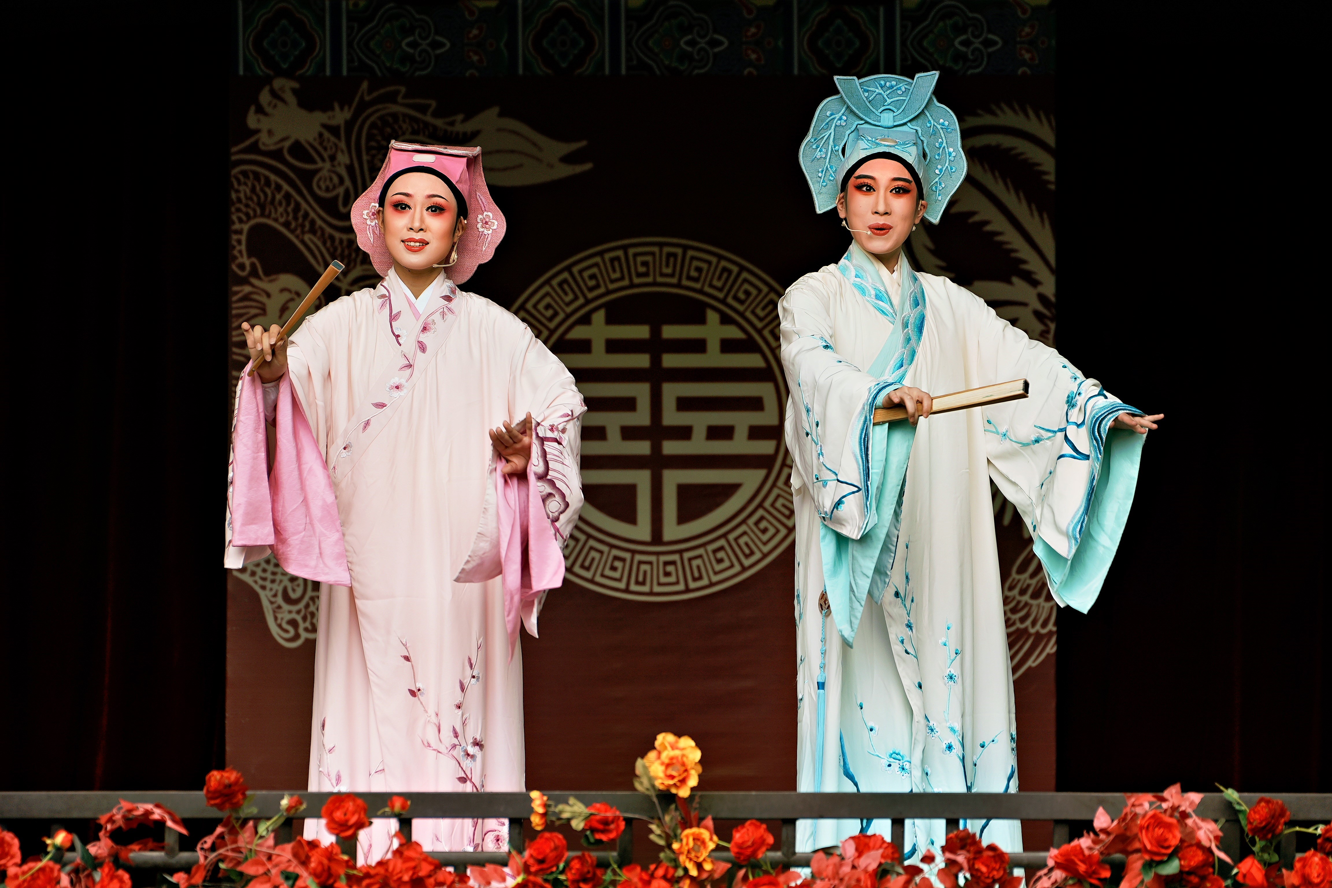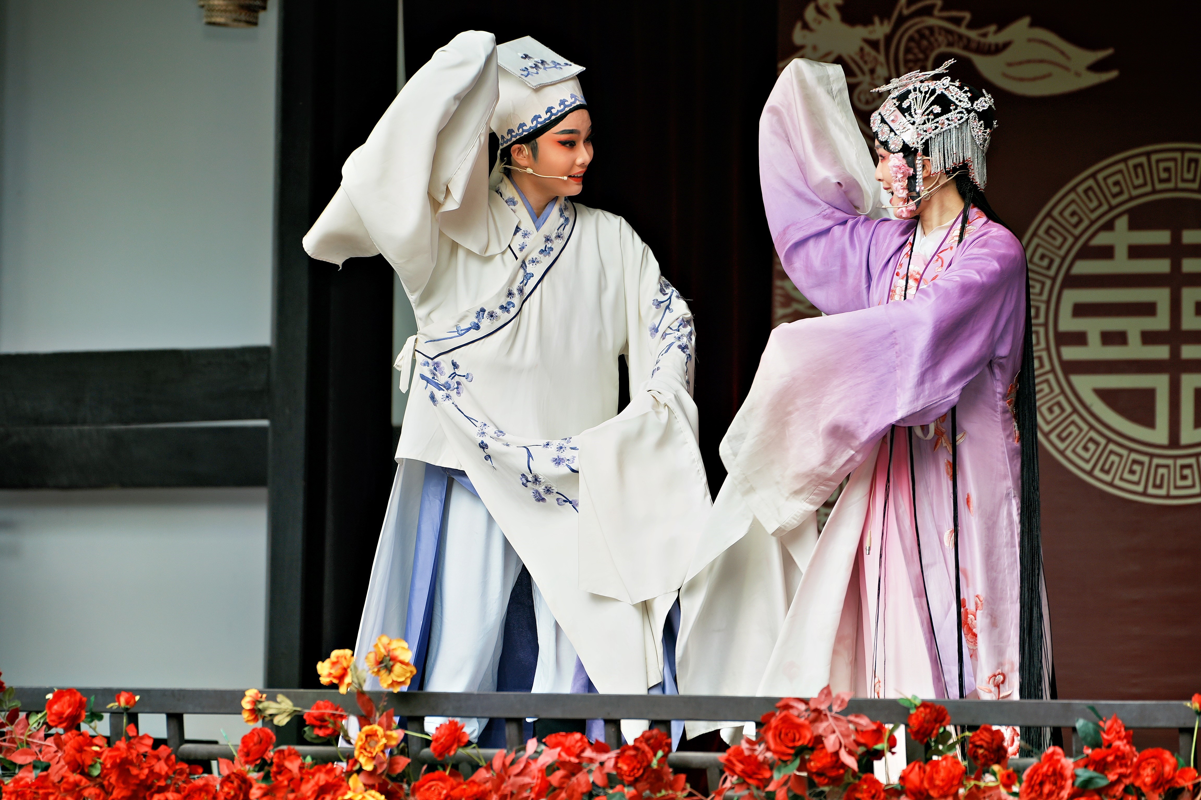 在本次活动中,戏剧系黄静安、吴淼琪、鲍秋静、吕甜甜、周冠妤等学生于东湖景区为游客及市民带来了经典越剧折子戏《梁祝·十八相送》与《牡丹亭·幽媾》的演唱,以专业的表演技巧、真挚的情感表达,赢得了现场观众的热烈掌声与高度认可。在巾山广场,他们为观众献上了《山河恋·送信》与《沙漠王子·算命》等越剧经典选段,展现了越剧艺术的多样魅力。这一场场精彩的演出,不仅彰显了戏剧系学子的艺术才华, 丰富了台州府城国庆假期的文化活动,更为古城增添了一道独特的风景线。