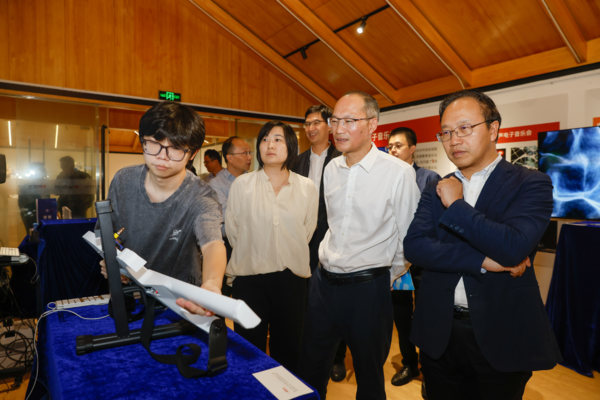 本次活动恰逢全省高校“百个艺术院系支部联村共建”工作现场推进会召开。会前,省委教育工委专职副书记、省教育厅党组副书记许翰信,中国美术学院党委书记金一斌、西湖区委常委、组织部长李军以及省教育厅组织处、各兄弟高校组织部、西湖区委组织部和转塘街道党工委负责人等领导一行在学院党委委员,组织部部长李俊陪同下视察数字音乐展厅,他们观看及操作每一件艺术科技展览作品,认真听取关于作品创作理念以及艺术与科技结合成果作品的介绍。许翰信对学院创新举措给予了高度肯定,他指出,这种将艺术与科技融合并带入乡村的做法,为高校艺术院系支部联村共建开辟了新路径,更使乡村普及到的音乐现代化、科技化。