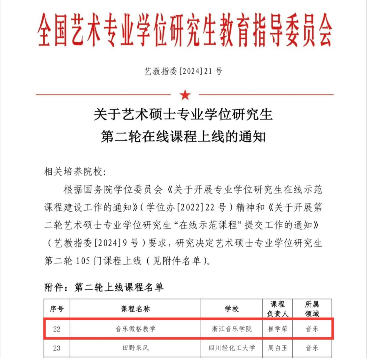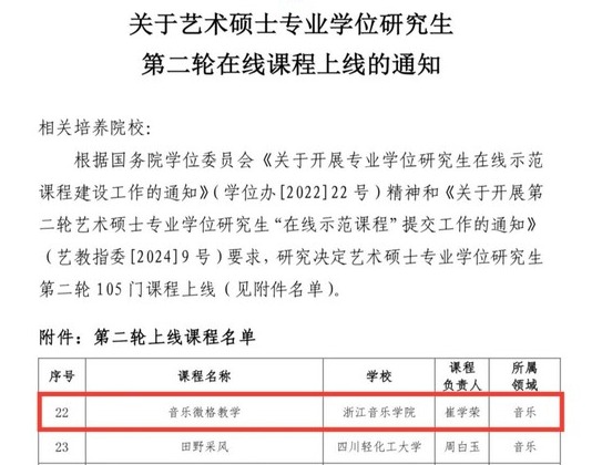 近日,全国艺术专业学位研究生教育指导委员会公布了第二轮艺术硕士专业学位研究生“在线示范课程”名单,由音教学院崔学荣教授团队开设的《音乐微格教学》课程成功入选并上线。