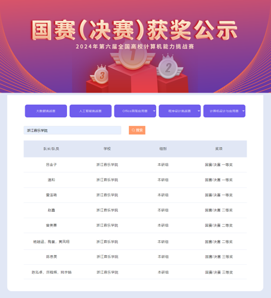 在近日结束的2024年第六届全国高校计算机能力挑战赛中,我院学子经过区域赛/省赛、国赛/决赛的激烈角逐,最终斩获Office高级应用赛、计算机设计与应用赛国赛/决赛奖项8项,其中,一等奖3项、二等奖3项、三等奖2项。在Office高级应用赛中,音乐学系吕金子、音乐工程系温和、音乐教育学院雷泽璐获一等奖,音乐学系赵鑫、流行音乐系曾美惠获二等奖,钢琴系陈恩美获三等奖。在计算机设计与应用赛中,国乐系杨越涵、梅景、黄凤翔团队获二等奖,音乐教育学院陈泓卓、厉程辉、姚宇皓团队获三等奖。