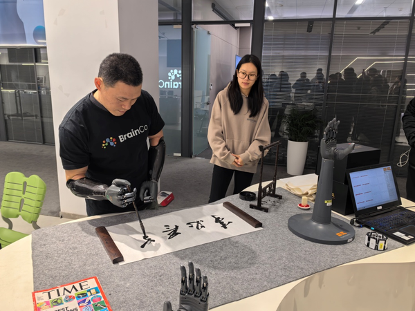 在强脑科技公司展厅,师生们近距离观摩了多款创新产品,如创新产品智能仿生手,通过肌电信号、神经电信号捕捉和机器学习算法,使义肢能够精准识别用户动作意图,完成一系列复杂操作。现场两位体验官用智能仿生手分别完成了写书法、弹琴等高难度动作,令师生惊叹不已。师生还体验了基于脑电波监测的助眠设备脑机智能安睡仪,和通过实时数据反馈直观感受自身冥想状态变化的正念舒压系统。此外,师生还了解了一款虚拟现实教学软件,该软件结合VR技术,通过模拟社交场景帮助孤独症儿童进行行为训练,展现了科技在孤独症康复中的潜力。技术人员还为师生详细解析了非侵入式脑机接口的核心原理,师生们也积极参与产品技术的交流与体验中。