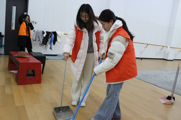 行动开始后,学生党员带领团员与入团积极分子对戏剧系6间舞蹈排练厅和22处重点区域开展清扫行动。大家按照专业剧场标准清洁窗台,认真擦拭镜面,整理教学用具,将舞台管理经验融入劳动细节。活动中创新建立“1名党员+3名积极分子”传帮带小组,将22个卫生盲区纳入“党员责任区"长效管护,让党旗始终飘扬在服务一线。
