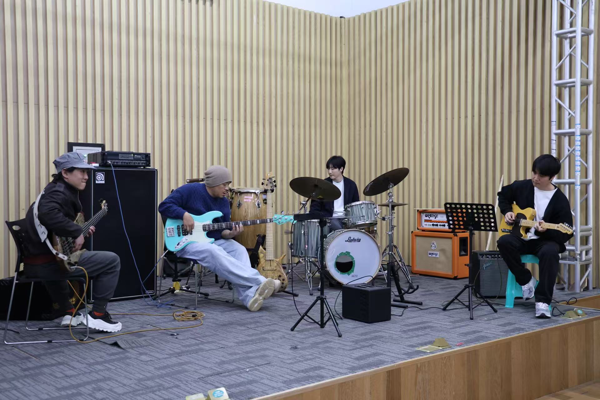 活动中,任宇清以幽默风趣的语言风格,辅以珍贵的影像资料与音频范例,系统梳理了其跨越30余载的艺术历程, 从早期摇滚乐团的激情岁月到转型爵士领域的深层思考,为在场师生勾勒出完整的艺术发展脉络。随后,他与同学们谈及"音乐创作的终极追求"这一命题,学生群体达成的共识性回答"音乐应是灵魂的镜像",恰与主讲人"爵士即人生"的哲学理念形成共鸣。在实践教学环节,流行音乐系爵士吉他专业教师陈晓俊、低音提琴教师齐浩君、打击乐外籍教师李杰明及优秀学生代表受邀登台,与任宇清即兴完成多部爵士经典作品的创意改编,生动诠释了"音乐即兴创作中自由探索"的艺术真谛。最后,任宇清强调:"音乐艺术既是情感载体的具象化呈现,更是永无止境的美学求索。"他勉励青年音乐学子保持对艺术本质的追问,在技道并进中实现专业成长。