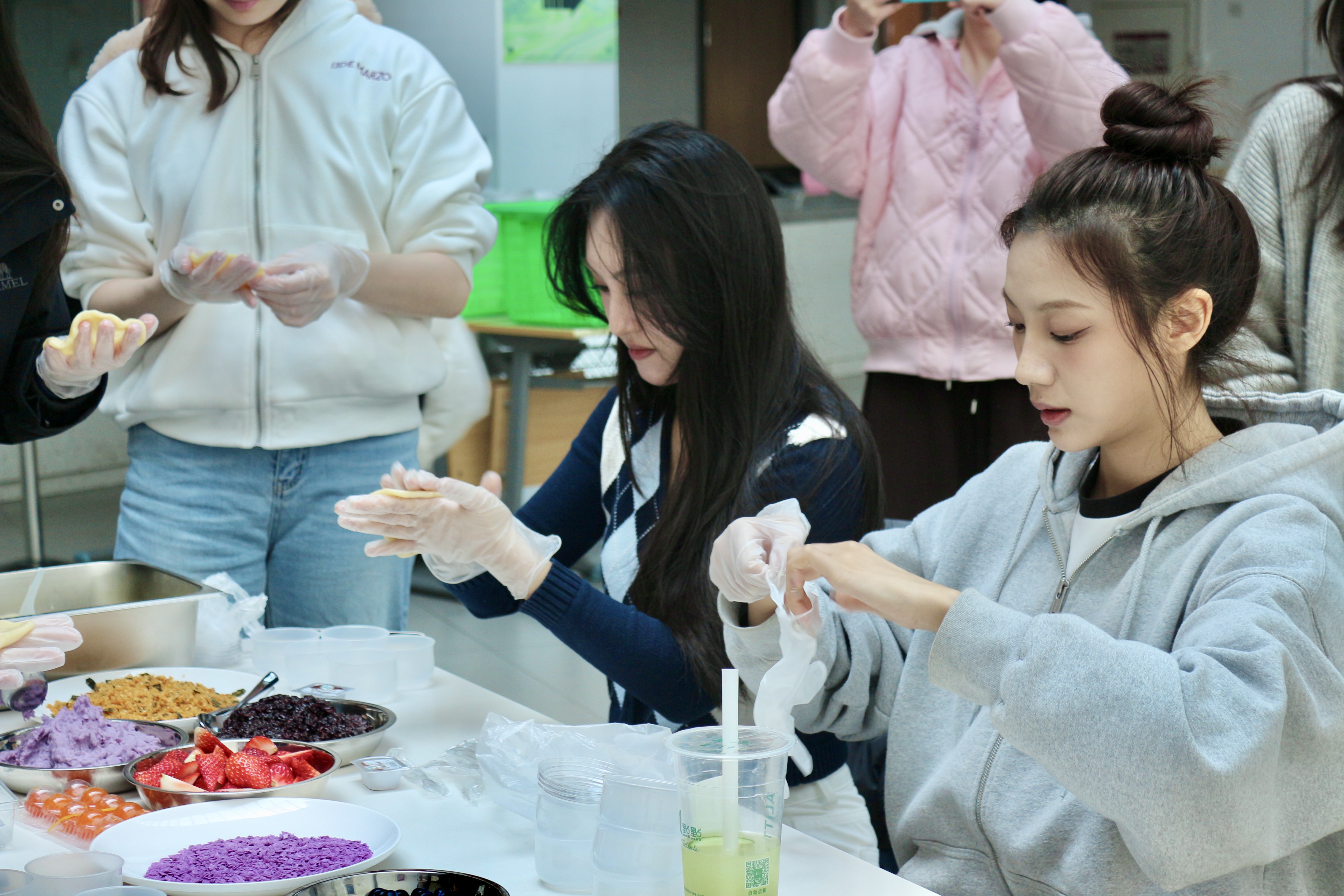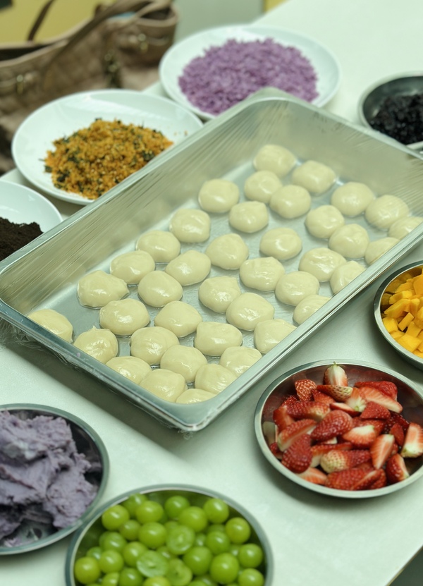 活动伊始,甜点师傅现场示范水果麻糍的制作技艺。同学们化身“厨房匠人”,揉面团、添馅料、包麻糍、蘸原料,指尖翻飞间,芋泥的绵糯、紫米的糯香、水果的清冽、奶油的绵柔被包裹进软糯外衣中,最后再包裹上一层奥利奥、海苔肉松、椰蓉或黄油脆脆,一枚枚精巧的麻糍就此成型。大家一边包麻糍,一边交流着自己家乡清明的习俗,不同地域的文化在这里相互交融。
