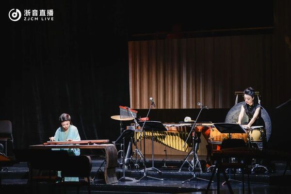曲目《弦鼓谈》由中央音乐学院古琴新秀亓淼与国乐系青年教师刘梦联袂演绎,上演了一出充满诗意的对话。这首曲目由王甫建教授创作,用独特的"琴鼓对话"形式重构了传统音乐的时空维度,古琴悠然雅致的音色与打击乐器丰富的音色和力度变化结合,表现出乐观豁达的人生哲理。二者之间相互对话唱和,表达“张弦述怀,击鼓明志”的思想境界。