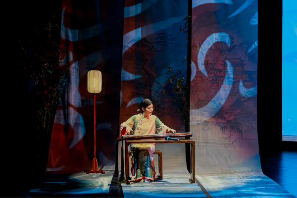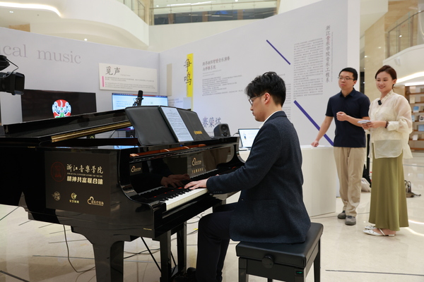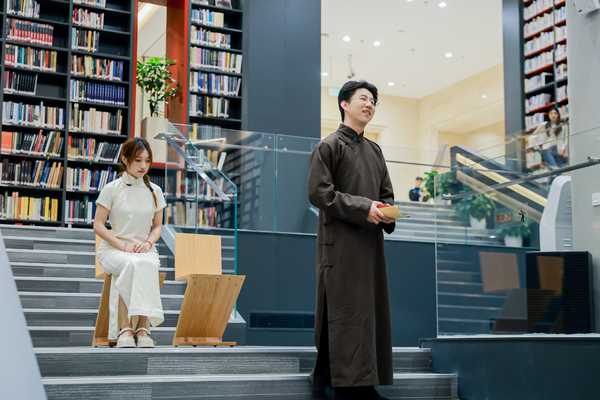 除书潮市集、数字音乐展、大咖知识分享秀等环节外,学院师生还组织策划了文学戏剧、钢琴艺术普及、宋词古典音乐会等内容。4月20日和23日晚,由戏剧系师生表演的《金锁记》分别以沉浸式人物和舞台戏剧形式,呈现于浙江图书馆各馆空间和文澜剧场,以戏剧之名让文字“活”过来、让角色“站”起来,生动营造出沉浸氛围;艺术指导教学部副教授张磊以“琴弦和鸣”钢琴合作艺术普及分享会的形式,与读者观众进行钢琴的N种“社交互动”;音乐教育学院MTC室内乐团则以“宋韵流声”宋词古曲音乐会形式,呈现一场大宋清音经典音乐会,精选姜夔《暗香》《疏影》等冷门遗珠,以及尘封于《明集礼》的《万年欢》、朝鲜李朝古谱改编的《雨霖铃》、日本唐传笛谱焕新的《苏幕遮》等经典作品,通过“一词多配”复现宋词依句为拍、字调入乐的独特韵律,为读者观众呈现千年旋律与当代审美的跨时空美学体验。