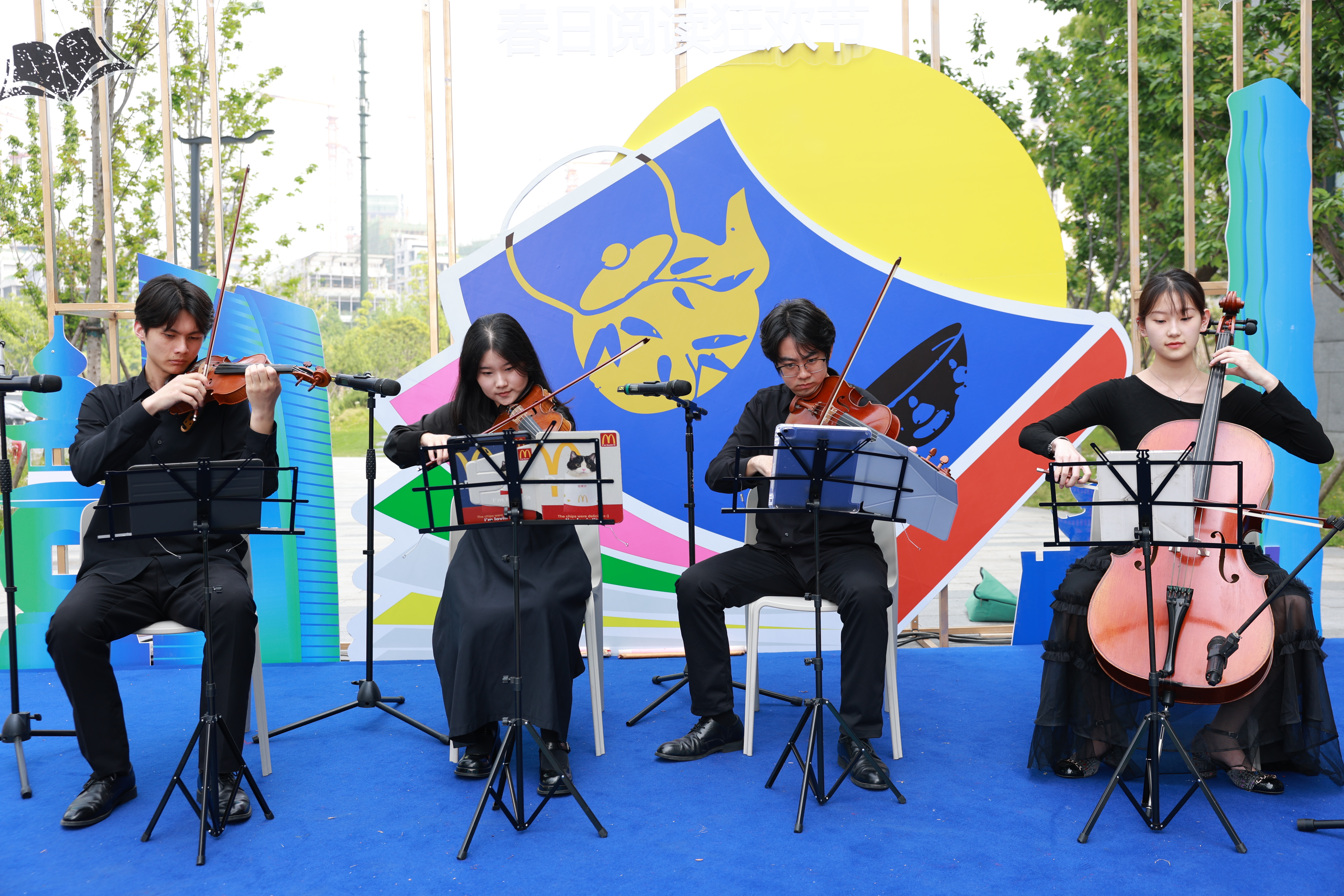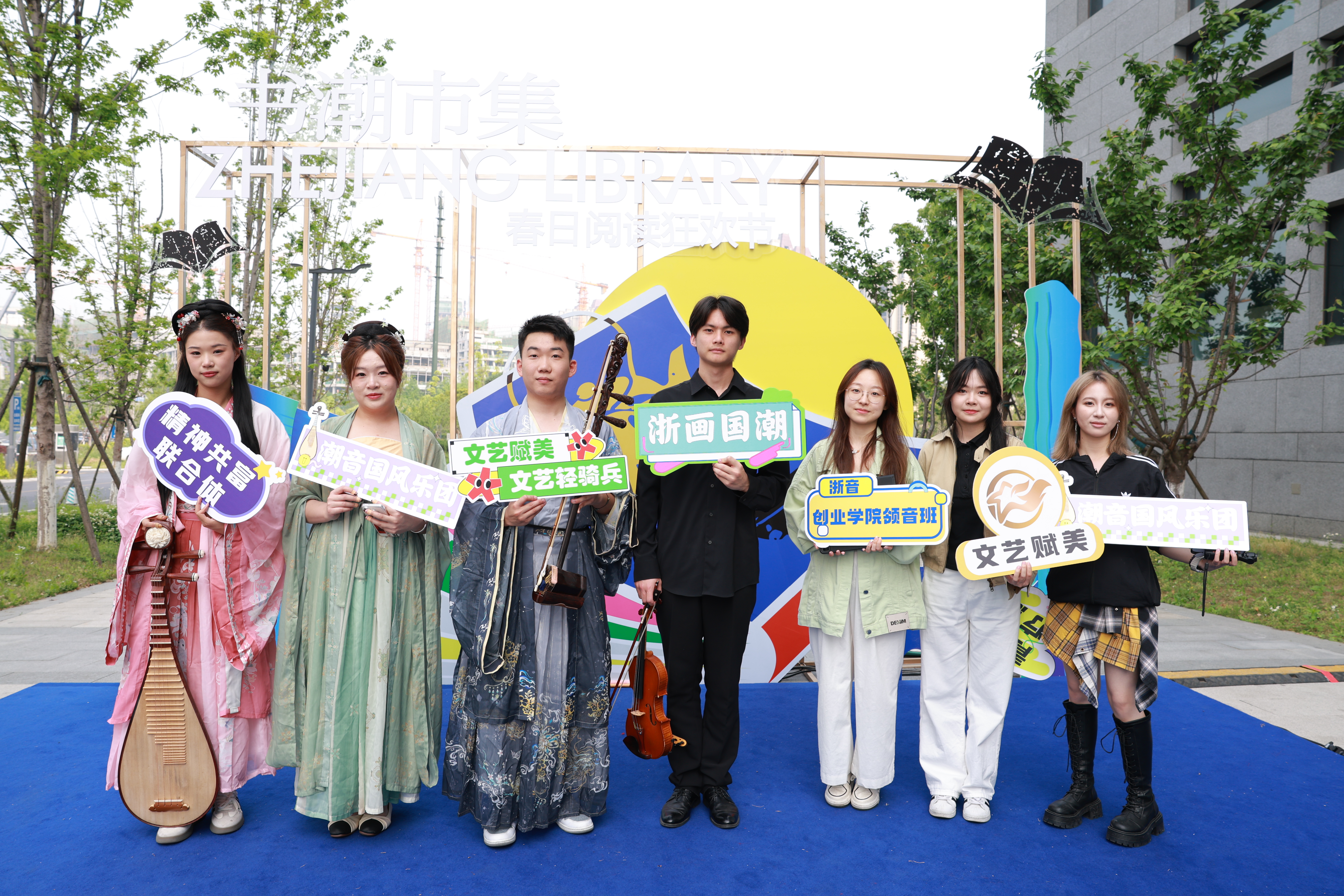 在浙江图书馆一楼广场举办的“春日书潮市集”中,设置了古籍文化传承、阅读互动、非遗手作体验、养生文化融合、AI科技体验、特色文创展示、戏剧文化展示、音乐文化展演八大版块。展演环节中,由创业学院师生团队策划组织的“弦舞飞扬”“国风雅韵”“声动之江”等内容篇章,为现场观众带来了西子弦乐四重奏、潮音国风乐团、HangIN阿卡贝拉等主题精彩演出,将音乐与阅读、艺术体验与文化消费相结合,为传统阅读体验注入潮流与互动元素,形成“可听、可看、可参与”的多维立体文化体验空间,吸引了大批市民游客参与。