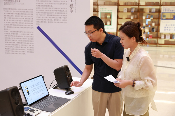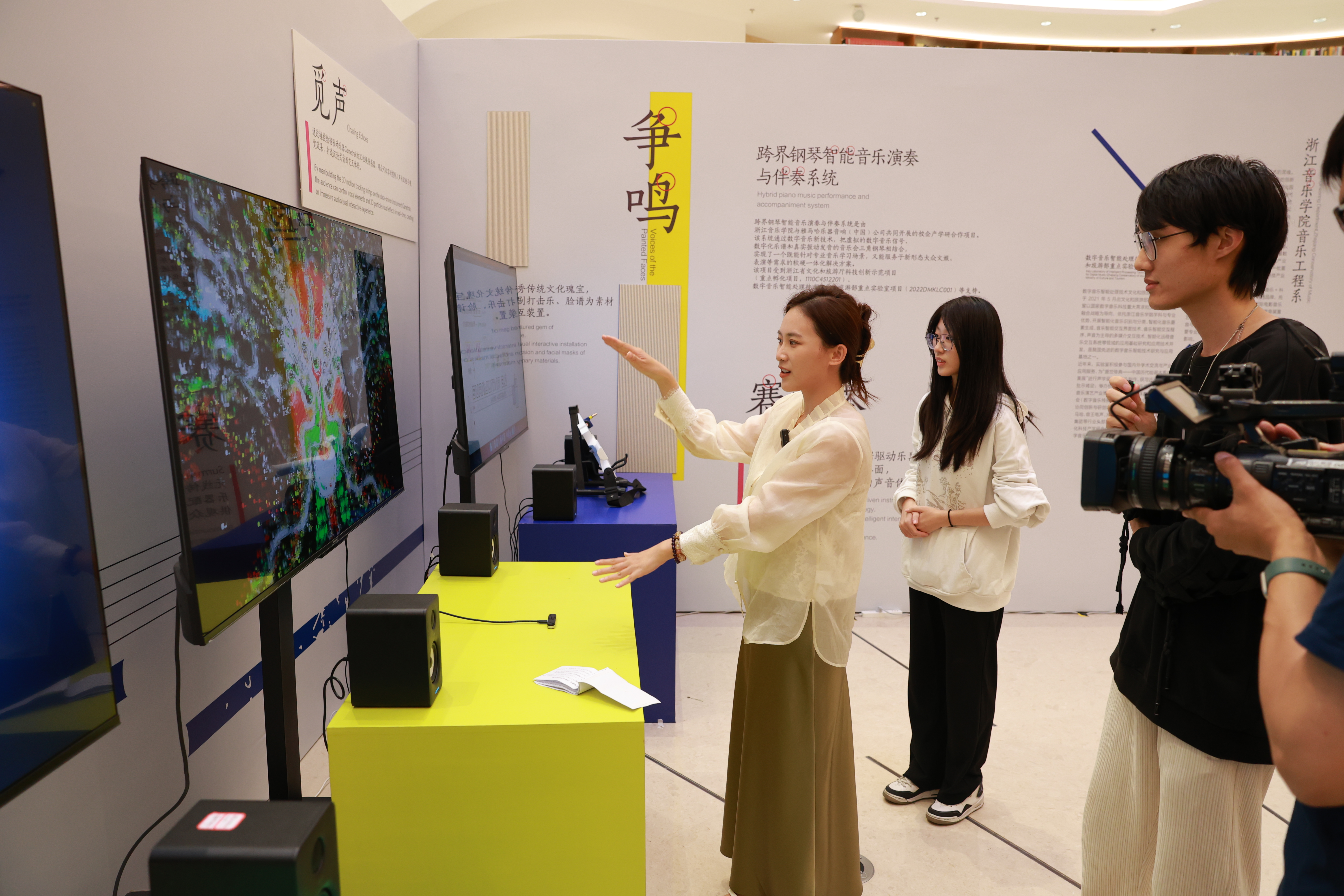 在浙江图书馆一楼大厅,活动特别策划了“当AI遇上古典乐”数字音乐体验展,展示了我院音乐工程系师生的科研创新成果,包括YAMAHA跨界钢琴智能音乐演奏与伴奏系统、Surmountar数据驱动乐器、音画交互装置《争鸣》《觅声》等项目作品,展现了音乐与科技的创新融合,吸引许多读者观众近距离参与体验。