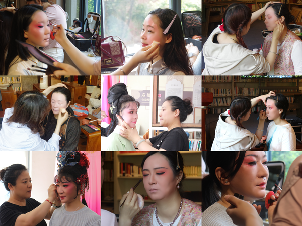 揉茶结束后,活动转入越剧艺术的绮丽世界。戏剧系尹派传承人、一级演员王一敏带领化妆团队的同学们以彩妆为笔,为参与越剧彩妆体验的教职工勾勒出黛眉凤目、朱唇粉面的经典越剧妆容。、