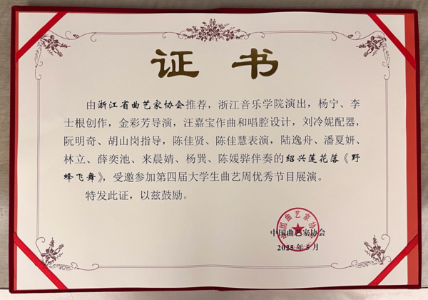 曲艺绍兴莲花落《野蜂飞舞》是继第七届浙江省曲艺杂技魔术大赛获银奖后,又一次登上全国的舞台。作品由金彩芳导演,阮明奇、胡山岗指导,陈佳贤、陈佳慧表演。作品以传统曲种为载体,融入现代音乐元素,用极具江南韵味的唱腔,为现场观众深情讲述了在科技特派员的帮扶下,乡村引进优质蜜蜂助力发展的故事。