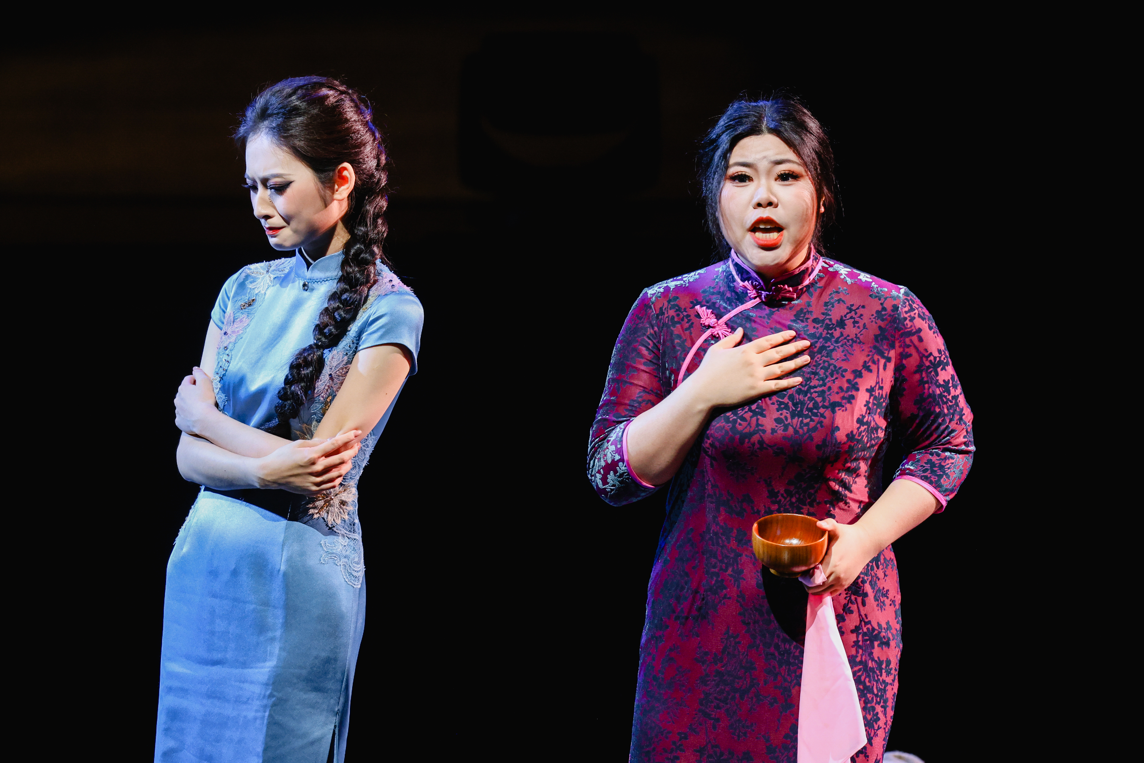 郭文景《骆驼祥子》扎根老北京胡同的悲欢离合,在棱镜第二面聚焦胡同深处的炽热烟火。陈艺田(饰小福子)在《这是人的世界》中以哀婉咏叹控诉命运枷锁,再现时代洪流下的个体沉浮。金凡雅与多莉雅(分饰虎妞)以声线张力诠释角色的泼辣与脆弱。值得一提的是,极具穿透力的戏剧女高音金凡雅以声音的极致控制力,成为整场演出最耀眼的棱光之一。在《虎妞之死》中,她从撕裂般的强音到游丝般的弱音,用音色的明暗对比精准刻画角色濒死前的挣扎与回光返照。作曲家笔下艰深的乐句,在她手中化为血肉,将角色的悲剧命运推向极致。为了帮助演员更好地诠释角色,虎妞原唱孙秀苇总监倾囊相授,从指尖颤动到眼神流转,逐字逐句雕琢刻画,将虎妞的泼辣、脆弱与不甘展现得淋漓尽致。许皓轩(饰祥子)的表演同样令人动容,其师从原版祥子饰演者著名男高音歌唱家韩蓬,他以克制的肢体语言与浑厚声线,将人力车夫的挣扎与尊严刻画入微。这对“师徒传承”的舞台对手,在唢呐演奏张家瑞高亢凄厉的即兴穿插中更显张力,传统民乐与歌剧唱腔交织,将市井婚姻的无奈与宿命感推向高潮。