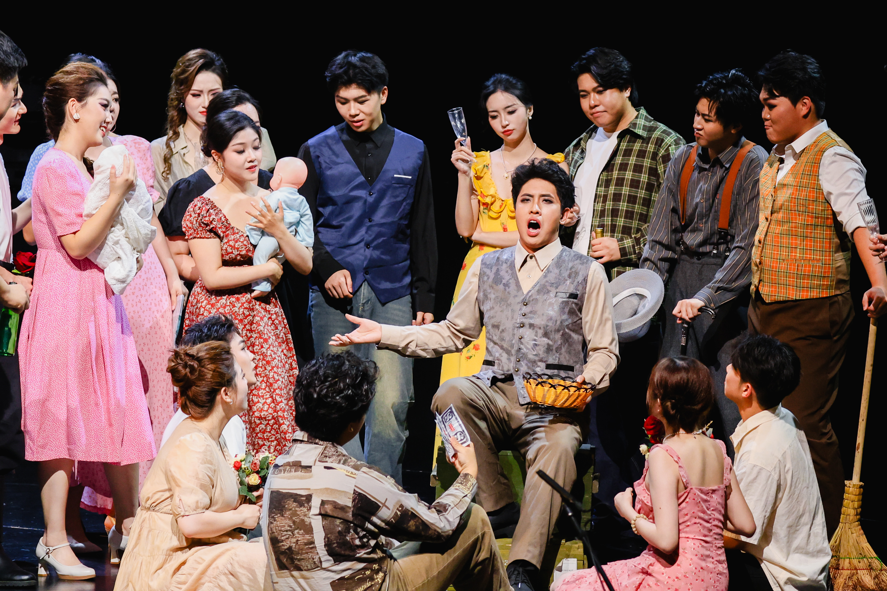 格什温《波吉与贝丝》迸发爵士与歌剧的激情共振,在棱镜第三面泼洒底层社会的斑斓爵士。多莉雅(饰克拉拉)以《夏日时光》的摇篮曲吟唱,将母性温情与爵士即兴完美融合;郑心烨(饰瑟琳娜)在《我的爱人已离去》中以撕裂式高音直击人心;刘靖涛与周业超(分饰波吉)以截然不同的声线诠释角色的复杂内核,李欣怡与李子懿(分饰贝丝)则以爵士咏叹碰撞出双重火花,一首波吉与贝丝的二重唱《贝丝,你现在是我的女人了》如同棱镜色散的光束,将爱情的热烈与脆弱凝为永恒瞬间;龚琦翔(饰Sporting Life)则以《未必如此》的戏谑摇摆,将黑色幽默与批判锋芒融为一体。