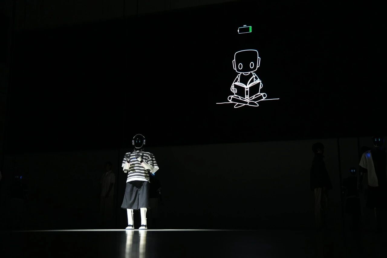 整场演出如一部微型电影,以四个篇章展开机器人从“职场化身”到“生活个体”的蜕变。序幕,机器人与演员身着同款制服,身份瞬间交融,隐喻机器人即是为生活奔波的人类。日间职场,机器人阵列精准群舞,再现高强度工作节奏,“电量消耗”的视觉化呈现,极具冲击;夜幕之下,它们挤“地铁”、显“疲惫”;直到返家、挣脱工牌,在下棋等生活场景中,“小确幸”通过声光巧妙转化为“充电”过程,深刻点题——“生活,才是终极充电器”。然后在又一个清晨,它们“满电”归来,重启平凡日常。