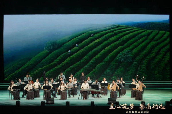 乐团以 “传承经典、创新表达” 为理念,携经典曲目《采茶舞曲》登台演出。这首乐曲由乐团艺术总监王甫建改编、指导,乐团的演奏家们以精湛技艺与默契配合,为观众呈现了一场兼具学术深度与艺术感染力的视听盛宴。这首曲目把民族乐器的音色特质充分激活,竹笛的清亮、二胡的柔婉、古筝的灵动、琵琶的清脆,共同构建起 “茶烟缭绕、茶农欢歌” 的听觉图景。竹笛模拟 “晨雾漫茶山” 的轻盈意境,旋律如茶香般缓缓弥散,随后扬琴轻敲 “点状节奏”,仿佛露珠滴落茶芽的清脆声响,瞬间将听众带入浙南清晨的茶山场景;通过全团合奏强化音色厚度,古筝的刮奏与二胡的滑音交织,收尾处竹笛与弹拨乐的呼应,仿佛夕阳下茶山归程的热闹景象。这种 “以音绘景、以乐叙事” 的手法,成为一部微型的 “江南茶山音画”,勾勒出江南水乡的婉约意境,为观众呈现了一场兼具学术深度与艺术感染力的视听盛宴。