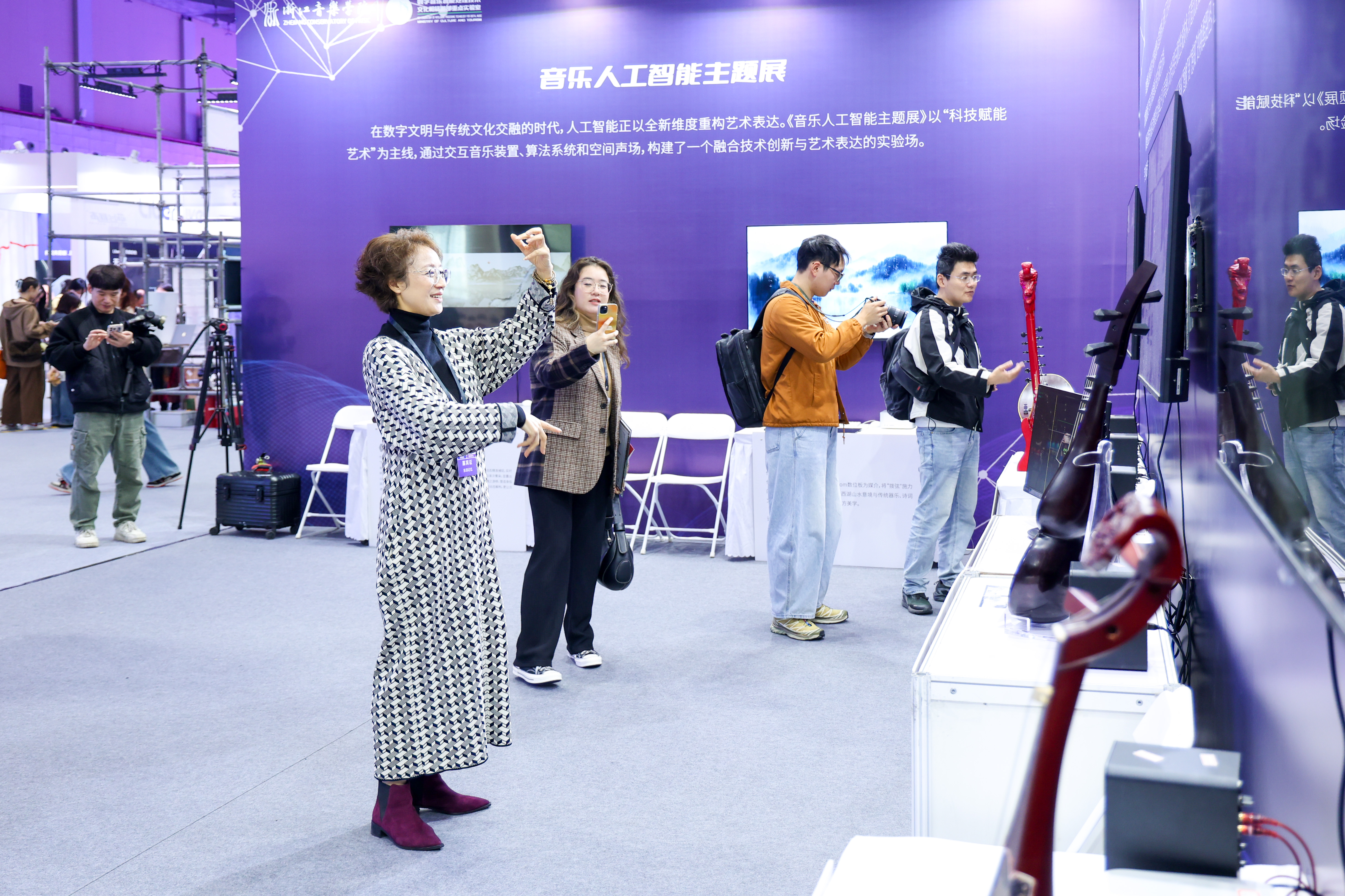 音博会期间,学院组织数字音乐智能处理技术文化和旅游部重点实验室、音乐工程系,共同呈现“敦煌石窟仿制乐器互动博物馆”“音乐人工智能主题展”“原创数字音乐展”与“沉浸声实时交互系统”等主题展区,其中“敦煌石窟仿制乐器互动博物馆”精心复原了壁画古乐器,引入声音感应、动作识别与视觉生成技术,音画联动,让数字空间成为连接历史与当下的“乐场”;“沉浸声实时交互系统”通过灵活定制音响布局、数量、声音空间轨迹及实时音频可视化效果,搭配特定的声音空间定位算法,构建起一套涵盖软硬件工程、内容创意与制作的沉浸声实时交互解决方案;“音乐人工智能主题展”则通过交互音乐装置、算法系统和空间声场,构建融合技术创新与艺术表达的实验场。通过丰富的互动体验与前沿的科技融合,成为本届音博会备受关注的亮点之一,充分展现学院在音乐科技与产业融合方面的探索成果。