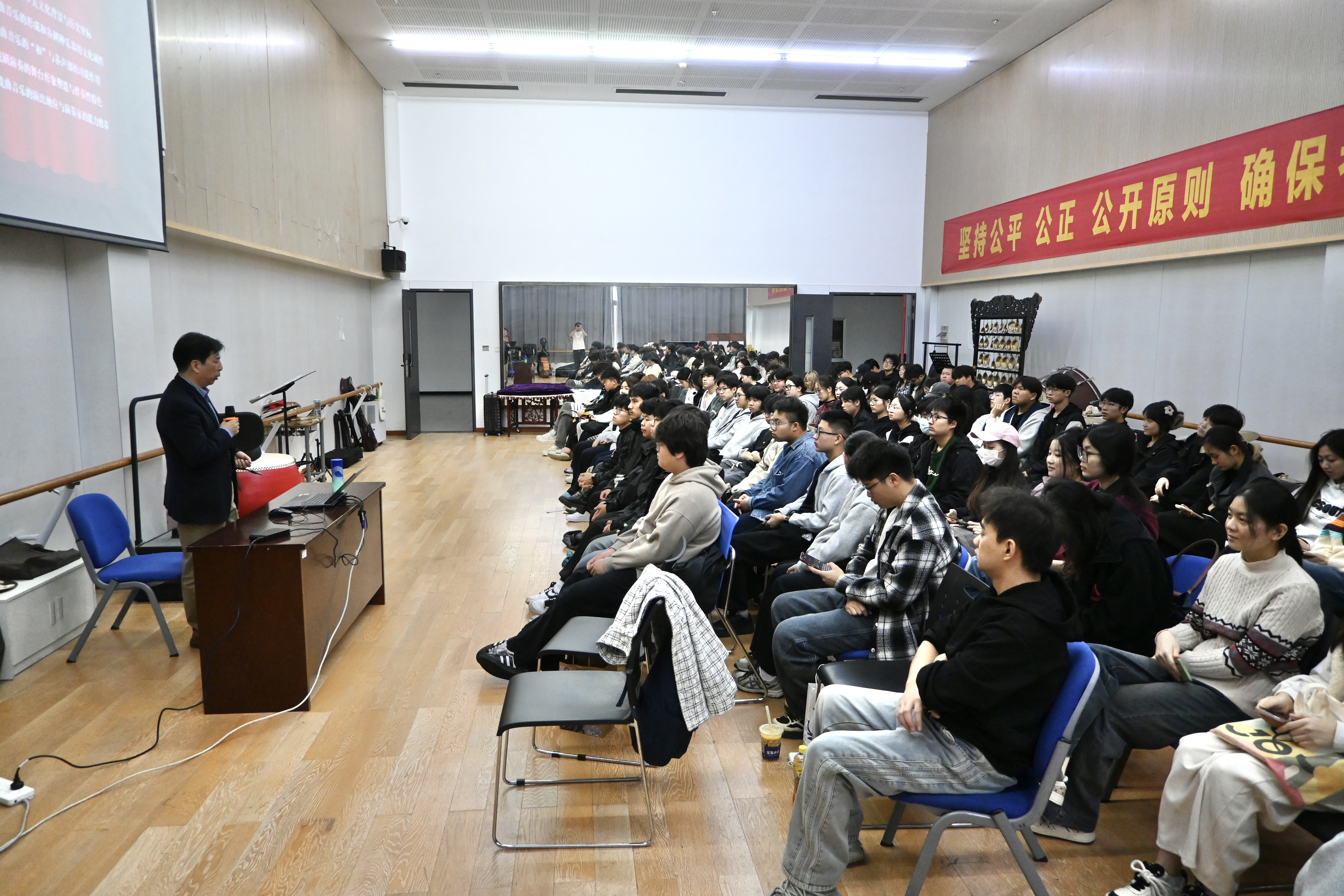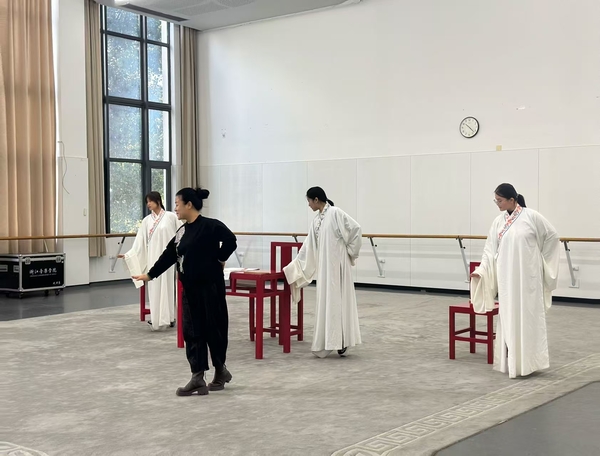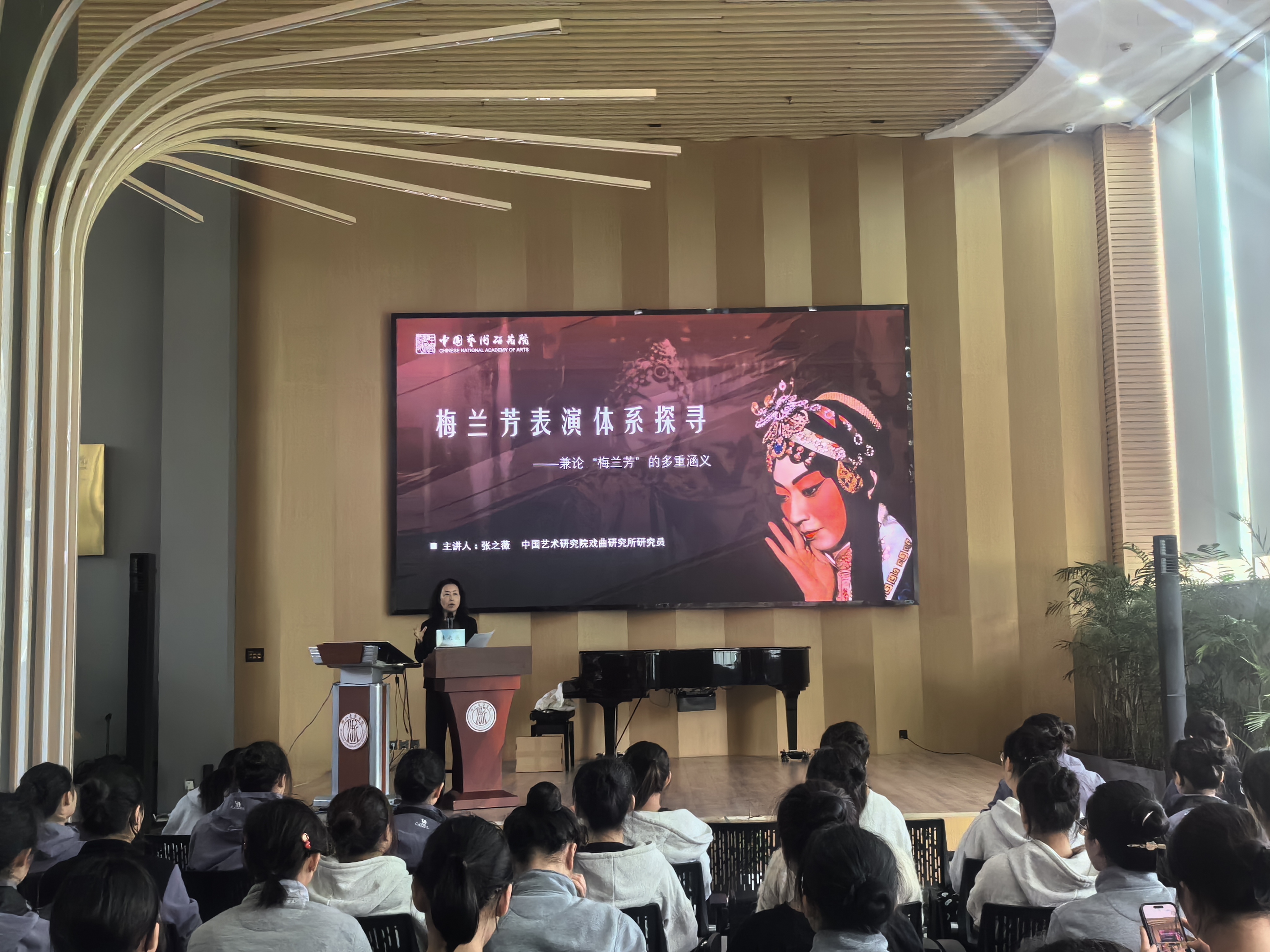 活动期间,一套层次分明、内容详实的课程体系成为提升学生专业能力的核心载体,实现了理论解析与实践指导的有机融合。越剧表演艺术家、中国戏剧“梅花奖”获得者陈飞带来的《基本功对角色塑造的重要性——以越剧<女吊>为例》专题讲座,结合经典剧目片段细致拆解,让学生深刻领会到基本功训练在角色情感传递与形象塑造中的基石作用;原浙江省文化艺术研究院戏剧研究所所长朱为总研究员主讲的《戏曲音乐伴奏的舞台形象塑造与演出地位》,重新定义“伴奏仅为辅助”的传统认知,系统阐释了乐队与演员“协同共生、相互成就”的舞台关系;王一敏、金彩芳、李公律3位资深教师联合开设的剧目公开课,采用“分组演练+即时点评”的互动模式,精准破解学生在剧目表演中的细节难题;中国艺术研究院研究员张之薇的《梅兰芳表演体系探寻》分享了梅兰芳大师从出身到学艺,再到“梅派”艺术构建、“移步不换形”理念的提出,以点带面让学生懂得“守正创新”的本质所在。教师周派的《走近戏剧艺术,发掘生活之美》与葛家川的《流行音乐演唱鉴赏》则实现了跨领域、跨剧种的知识赋能,助力学生构建多元立体的艺术认知框架。