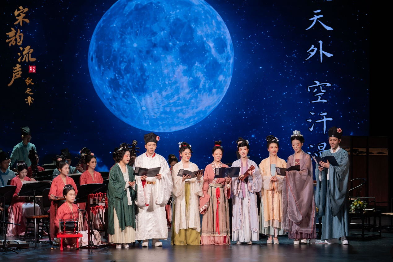 演出在音乐教育学院教师蒋骁然编创的《木兰花慢》中达到高潮,全体演员共同演绎辛弃疾的中秋问月词,在“是天外空汗漫,但长风浩浩送中秋”的磅礴气势中慷慨高歌。