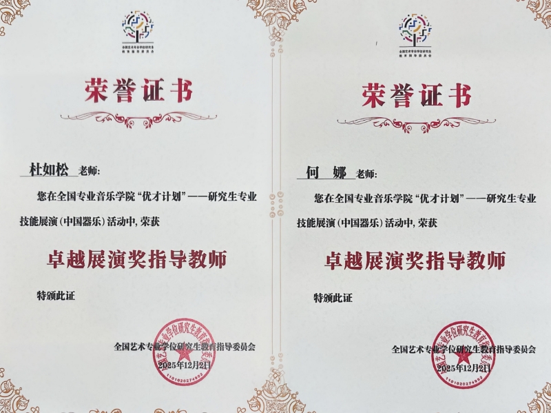 此外,国乐系研究生彭旎(指导教师:杜如松)与何欢(指导教师:何娜),荣获“卓越展演奖 ”和“卓越展演奖指导教师 ”,并在上海音乐学院贺绿汀音乐厅进行表演交流。