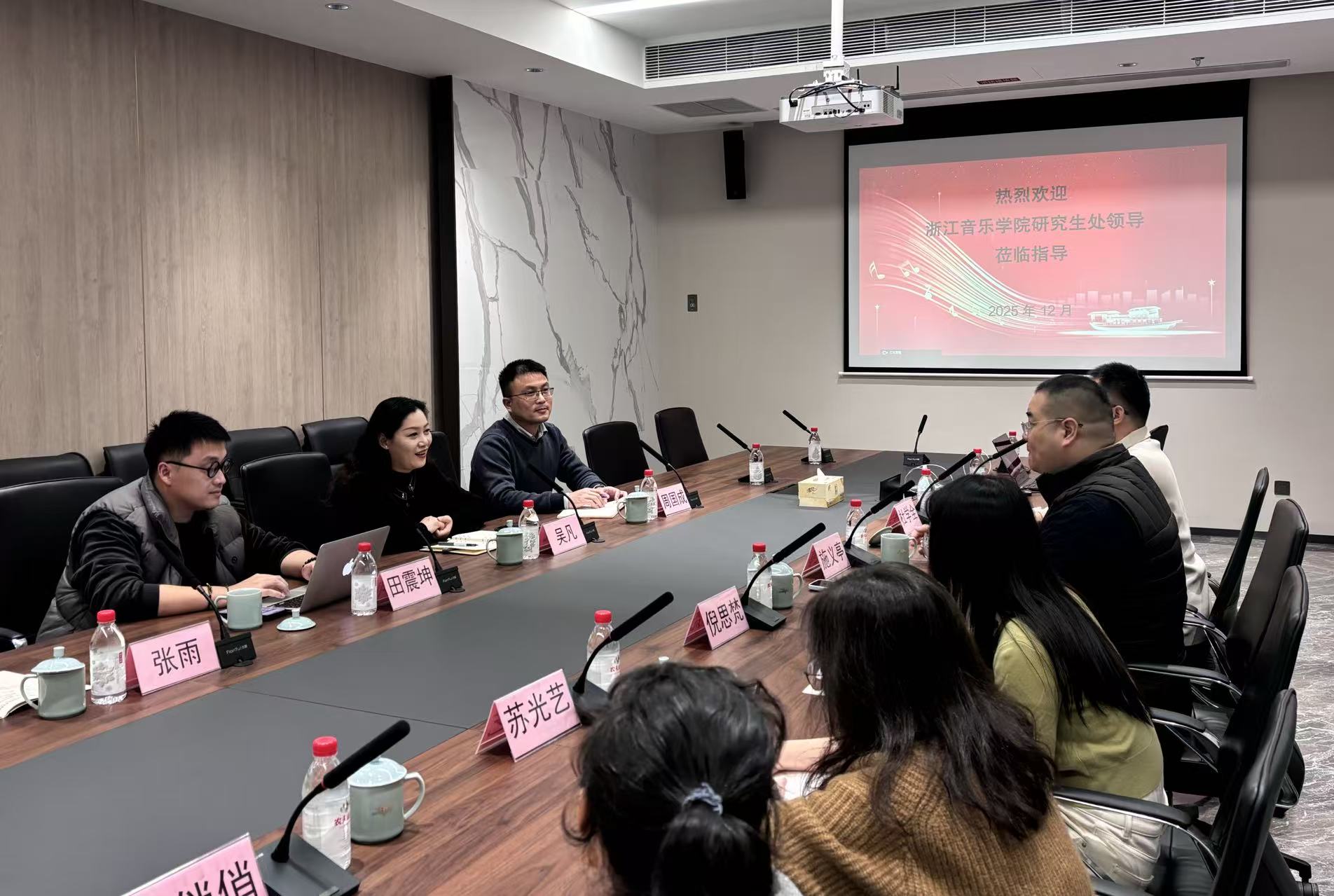 座谈会上,省博物馆综合部主任施义亭首先介绍了省博的总体情况和发展历程;研究生工作部部长吴凡介绍了浙音研究生培养和学科建设情况。双方一致认为,音乐学院的专业教学资源与博物馆的丰富文物馆藏具有高度互补性,可以发挥各自优势在实习实践基地建设、学术研究、人才培养等方面开展合作。博物馆的丰富馆藏与互动场景,将成为让人才培养的优质“第二课堂”——通过将音乐元素融入文物展览,不仅能打造沉浸式文化体验,使静态的文物“活”起来,也能为音乐专业学生提供跨学科实践平台,突破传统教学边界,使学生从文物中汲取创作灵感,在艺术与历史的交融中培养创新思维与实践能力。座谈会后,支部党员还参观了“相无古今——石窟艺术超感沉浸体验”专题数字化展览,切身感受现代科技与传统文化融合的创新成果。